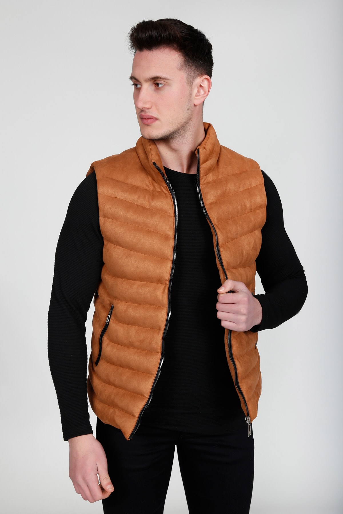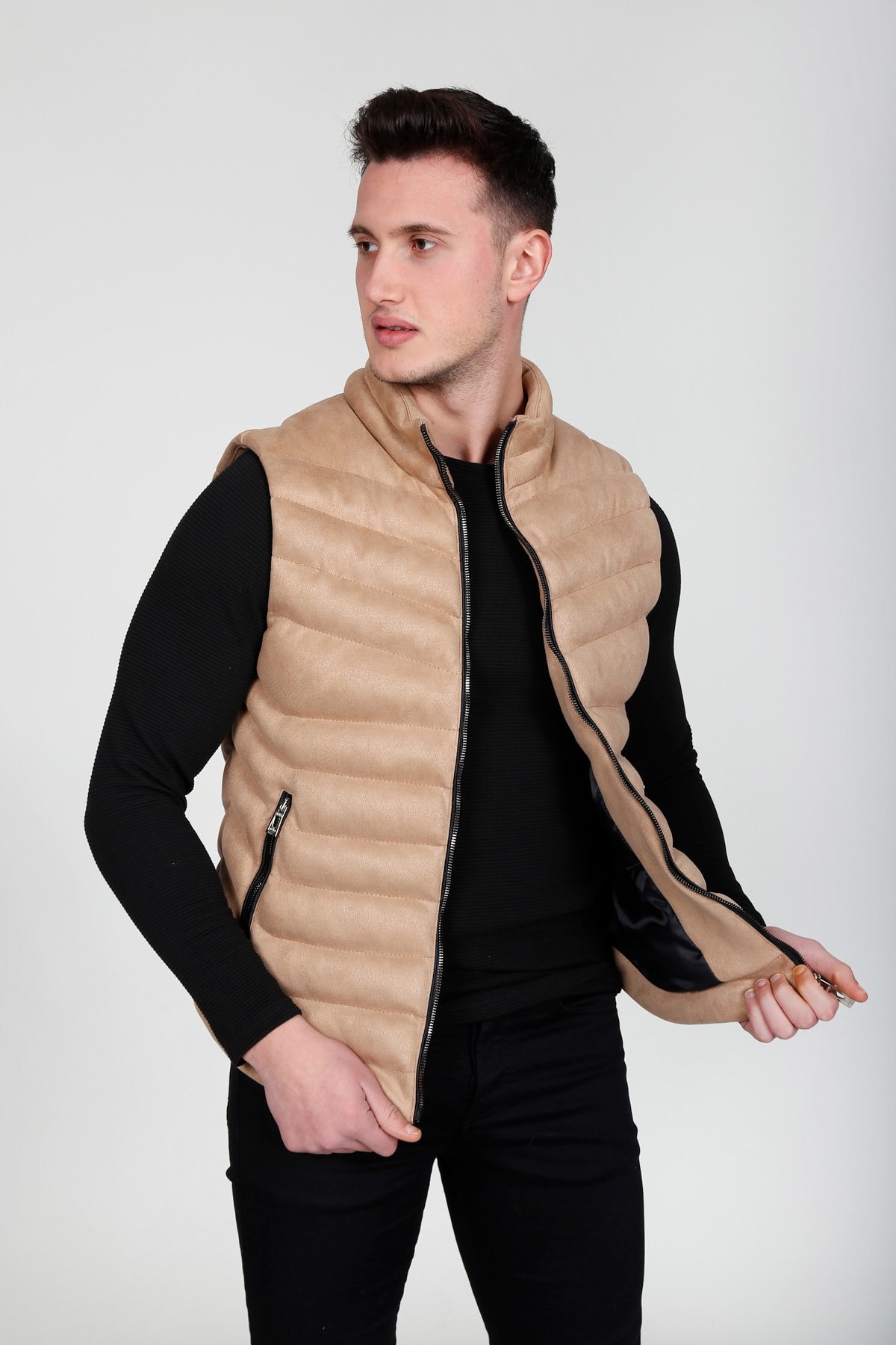 Standart boy ve kalınlıkta, balıkçı yaka tasarımı ile şıklığı ve rahatlığı bir arada sunan siyah nubuk süet şişme yelek