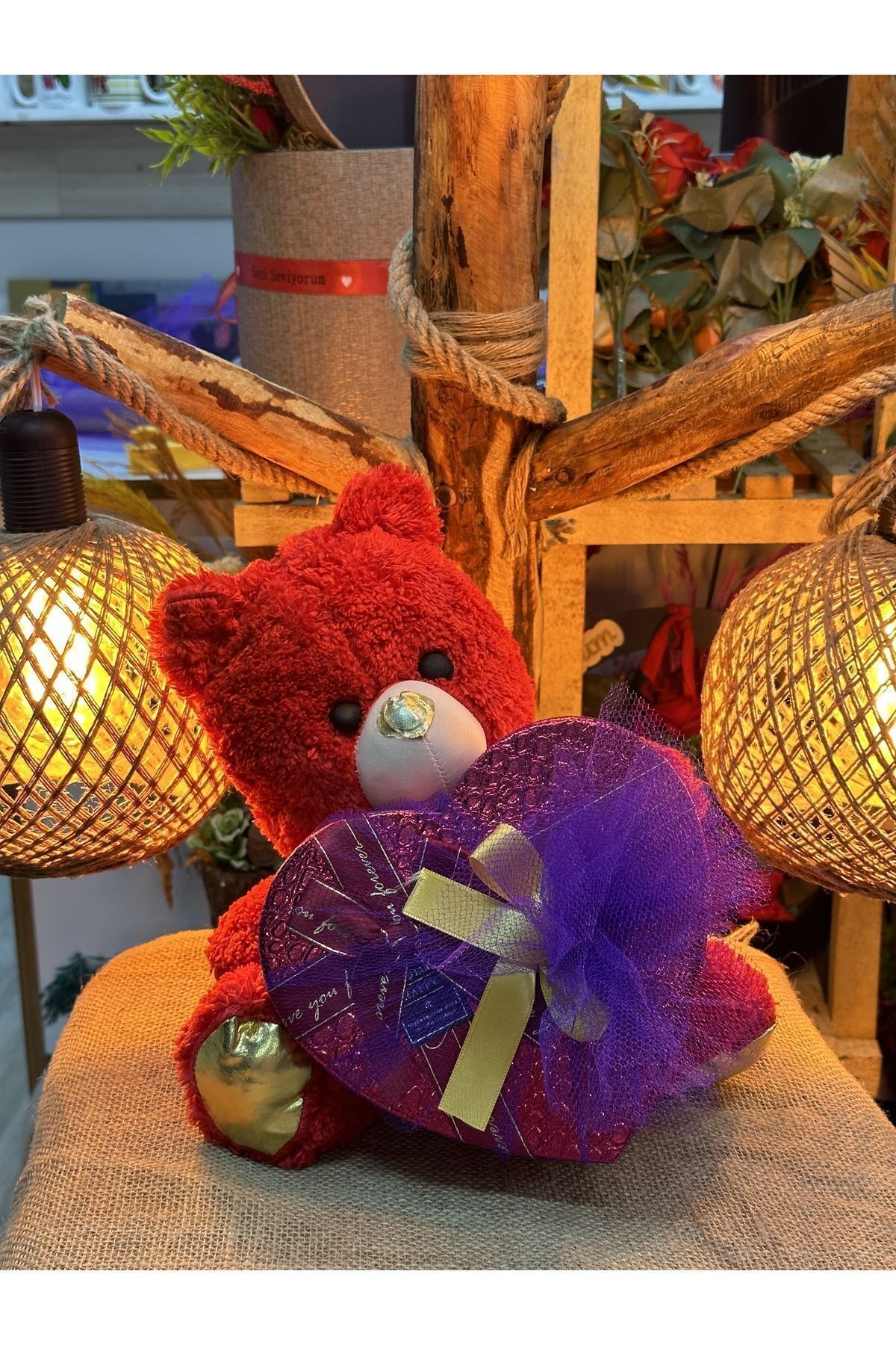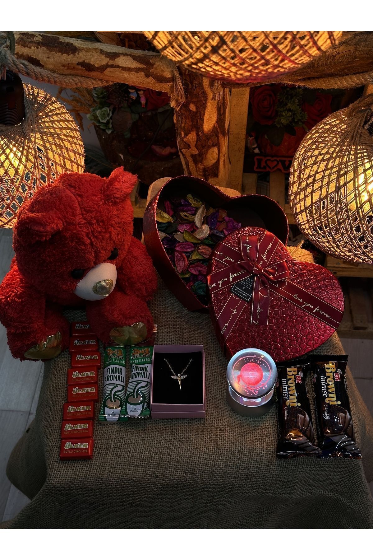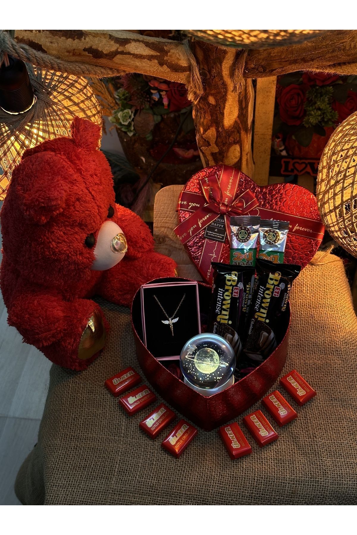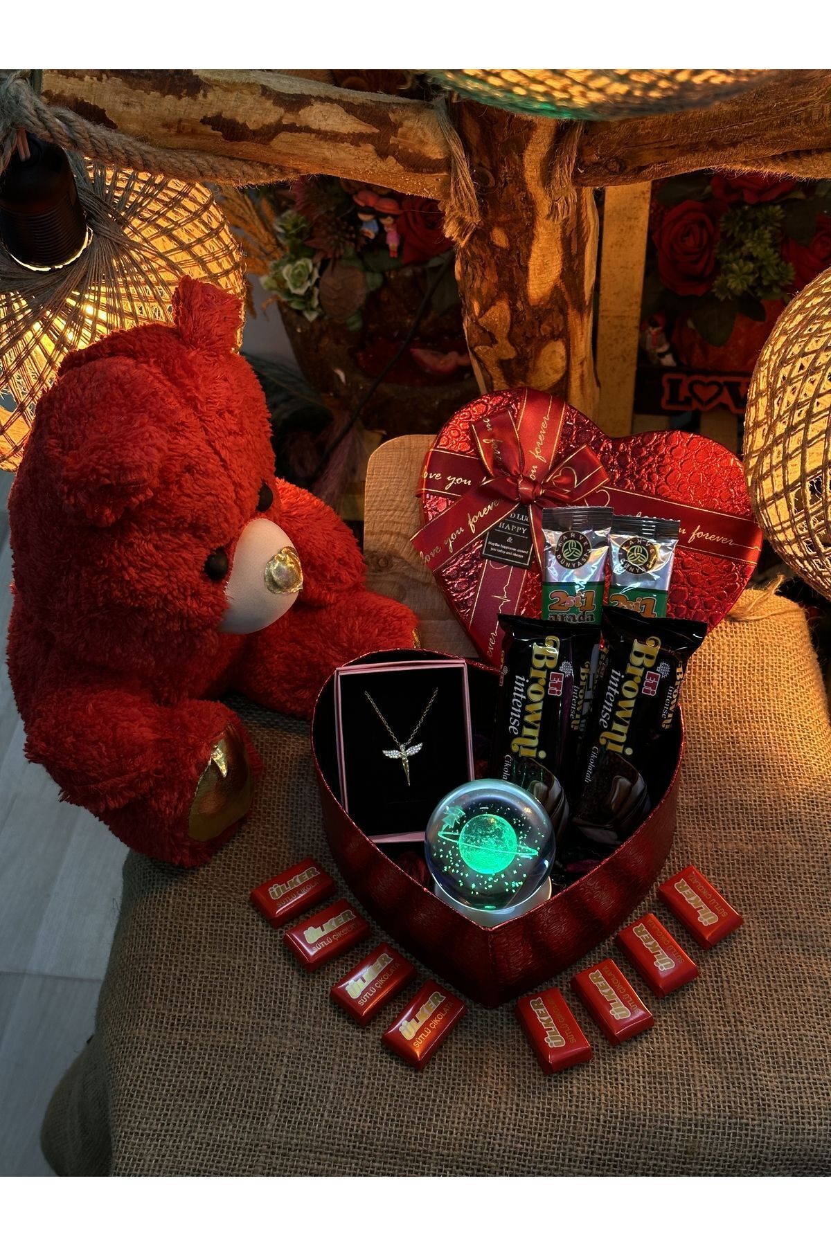 Merhaba içerisinde 10 adet napoliten çikolata 2 adet kahve 1 adet melekli zirkon kolye 1 adet Satürn ışıklı küre 2 adet browni çikolata 1 adet hediye kutusu 1 adet ayıcık Bir miktar kuru gül