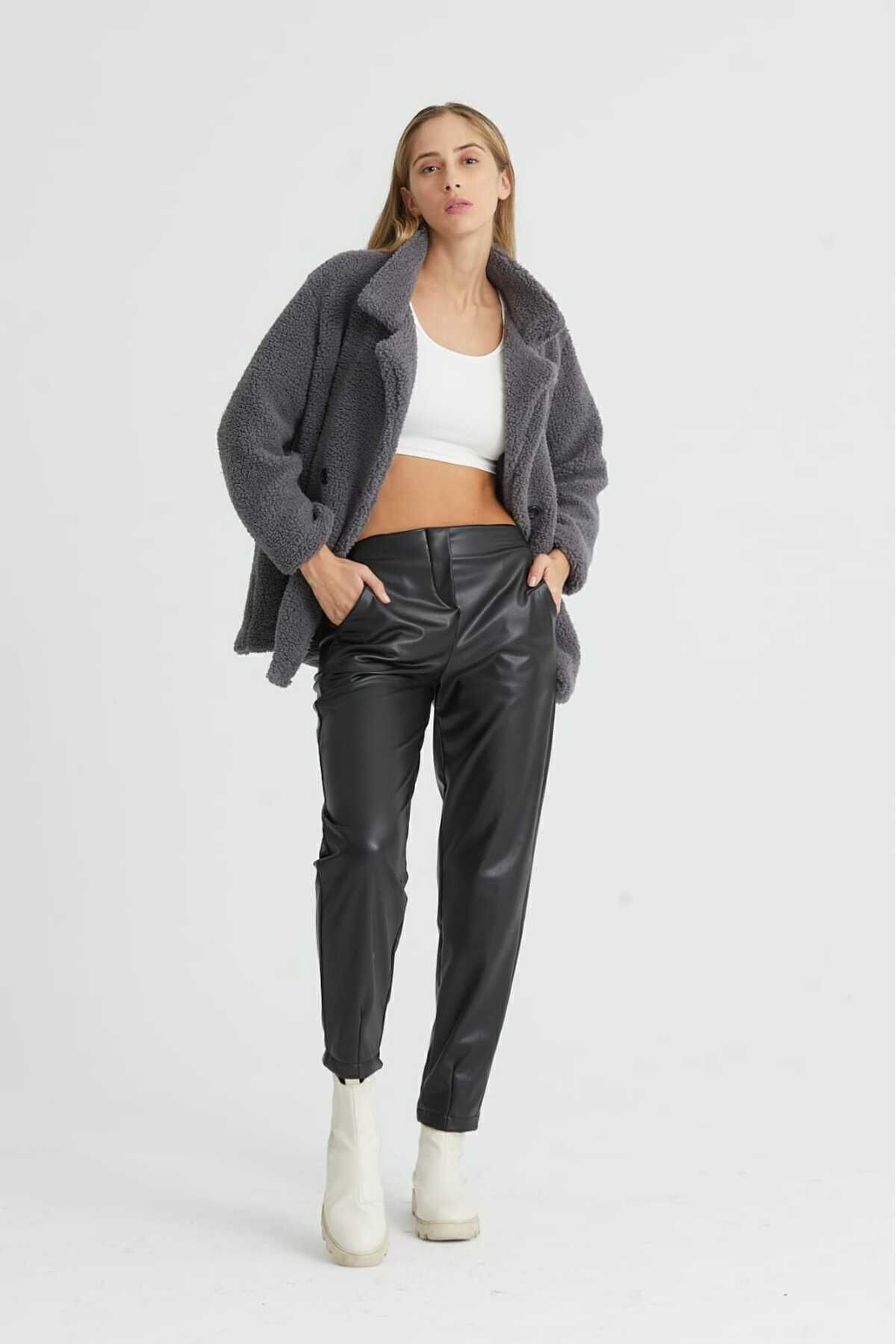 Ceket yaka detayı modern bir görünüm kazandırırken, düğmeli kapama şekli pratik kullanım imkanı sağlar.