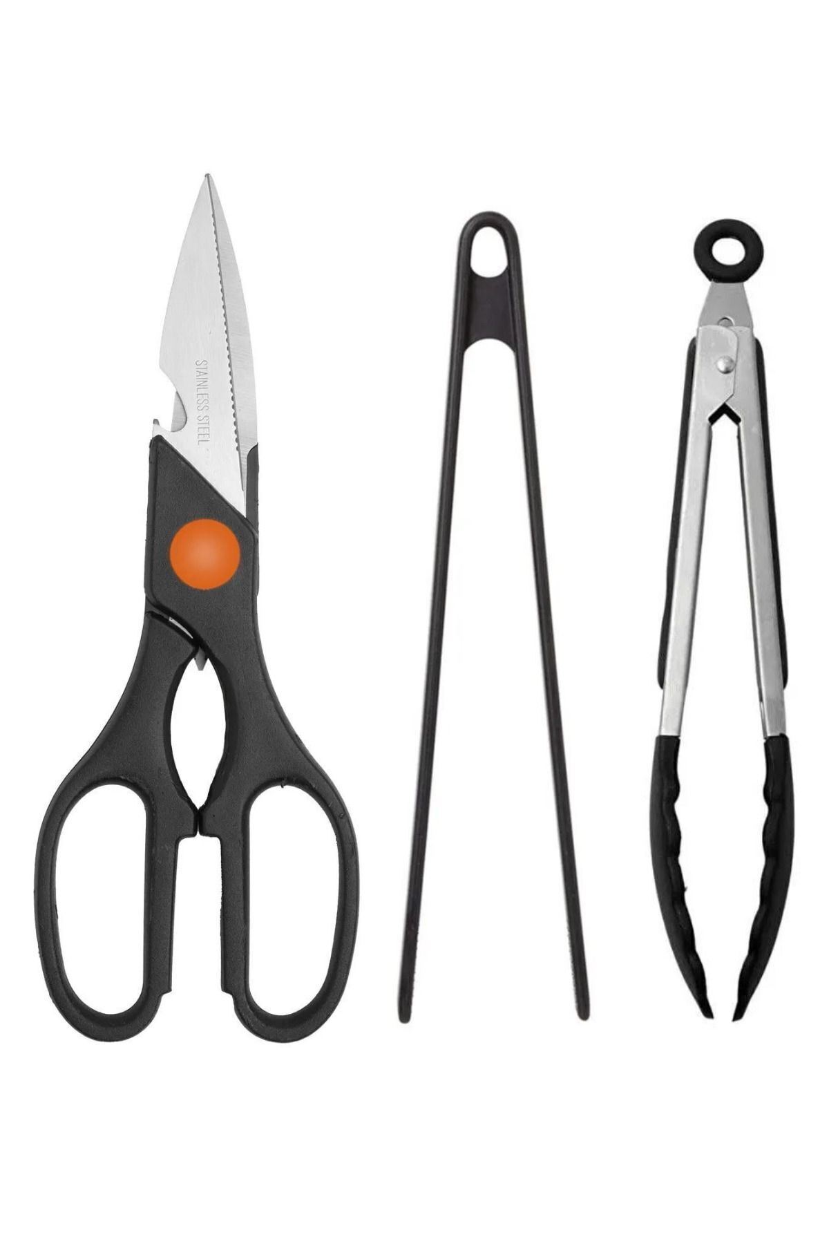 Çok Amaçlı Mutfak Makası Siyah, Metal ve Silikon Kızartma Maşası Seti
