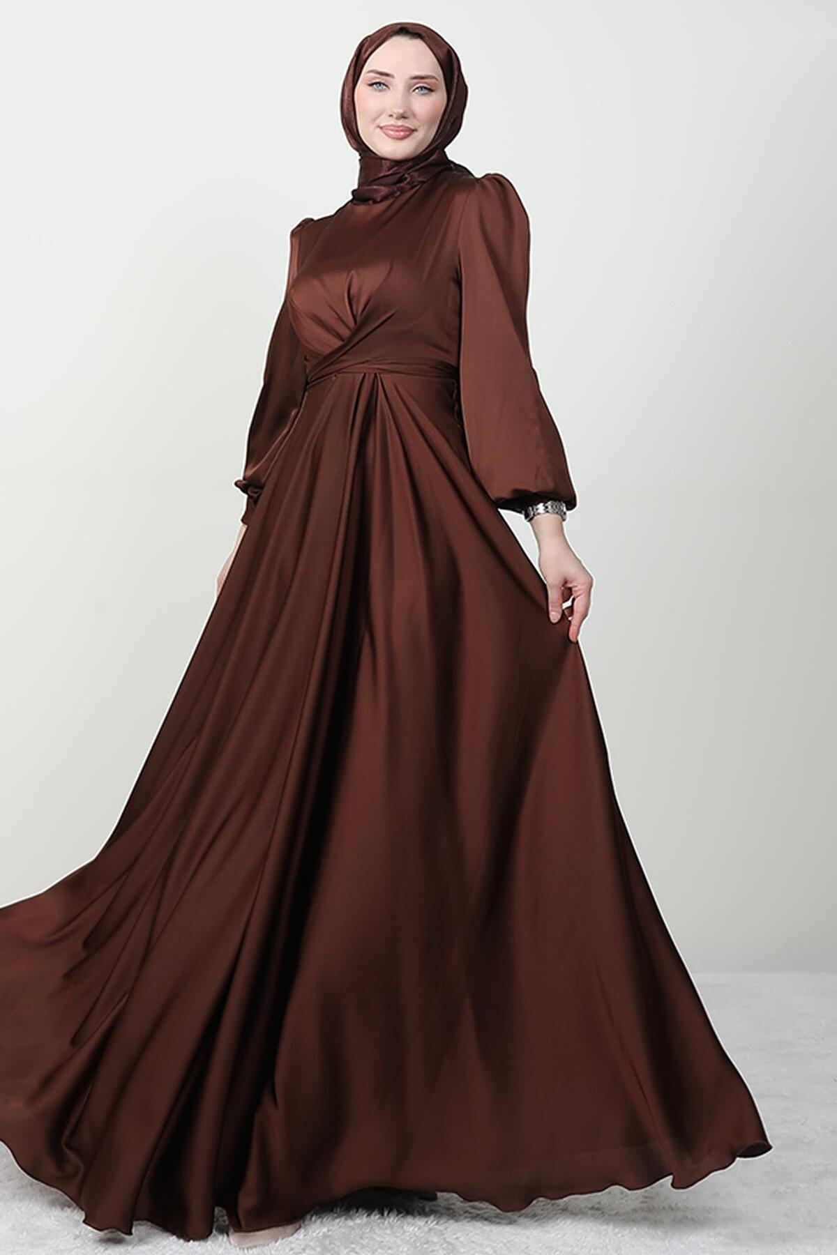 Saten kumaşın zarif dokusuyla öne çıkan lacivert abiye, tüm özel günlerinizde şıklığınızı tamamlar