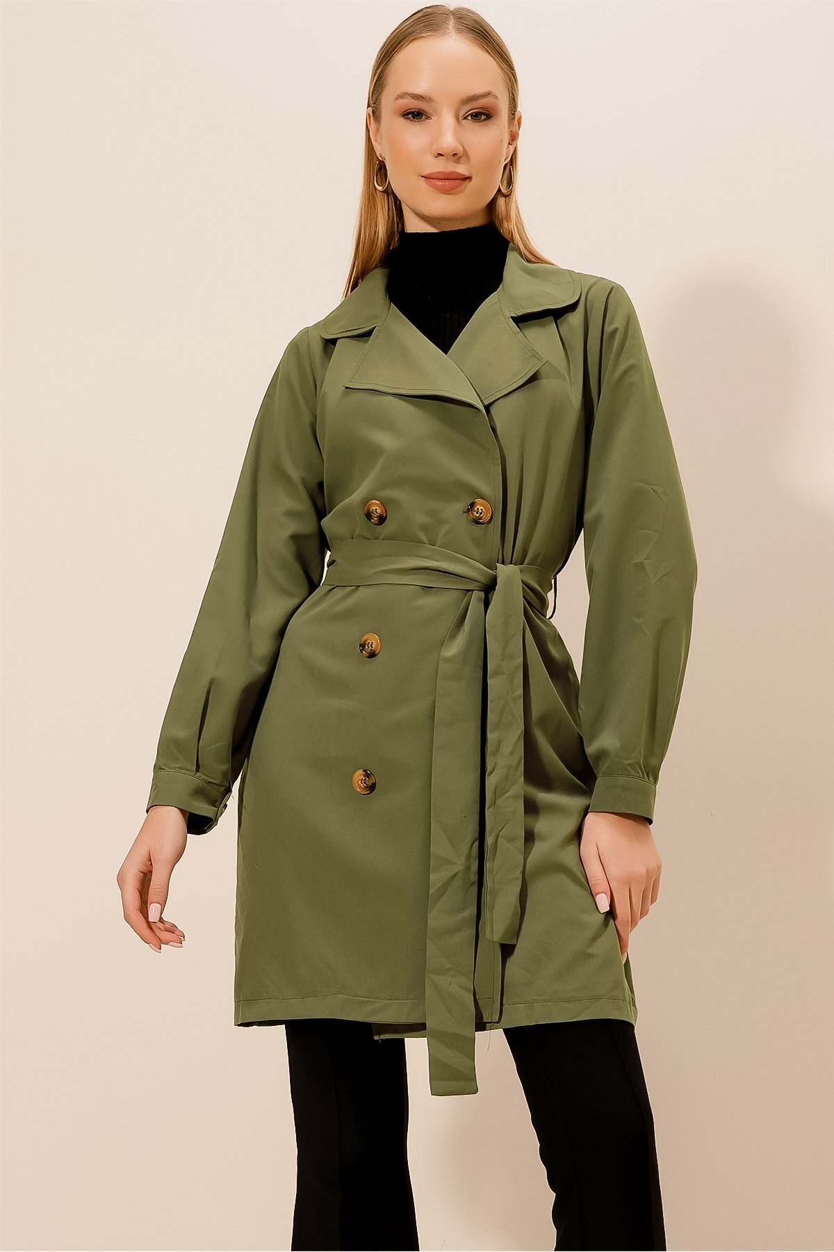 Kemer detayı belinizi vurgularken, düğme detaylarıyla klasik trençkot estetiğini korur