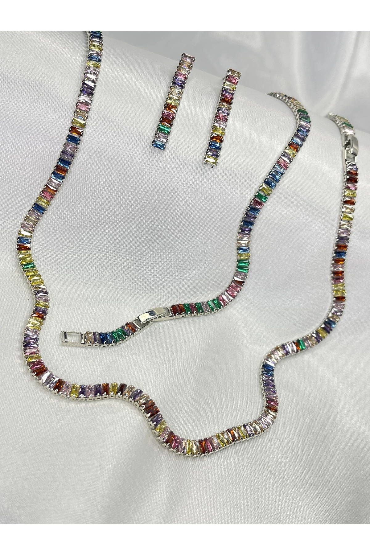 Göz alıcı zirkon taşlarla süslenmiş, şıklığı ve zarafeti bir arada sunan renkli taşlı su yolu çelik set takım