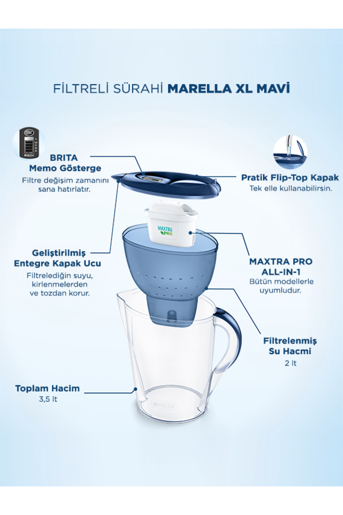 •BRITA Marella XL Filtreli Su Arıtma Sürahisi Kapasitesi: 3,5 lt Toplam Hacim (2,0 lt taze filtrelenmiş su)