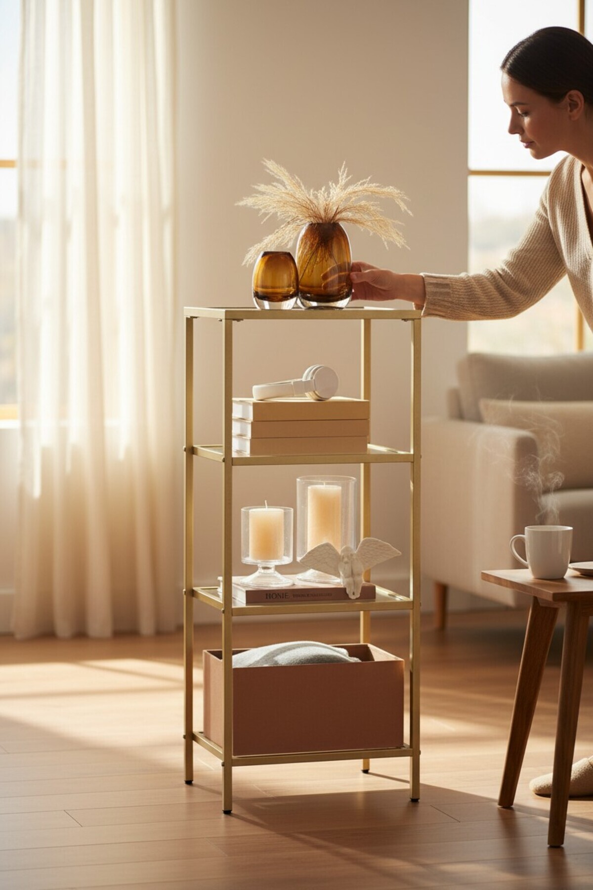 Modern 4 Katlı Metal İskeletli CamRaflı Kitaplık Aksesuar Rafı Ürün ölçüleri: