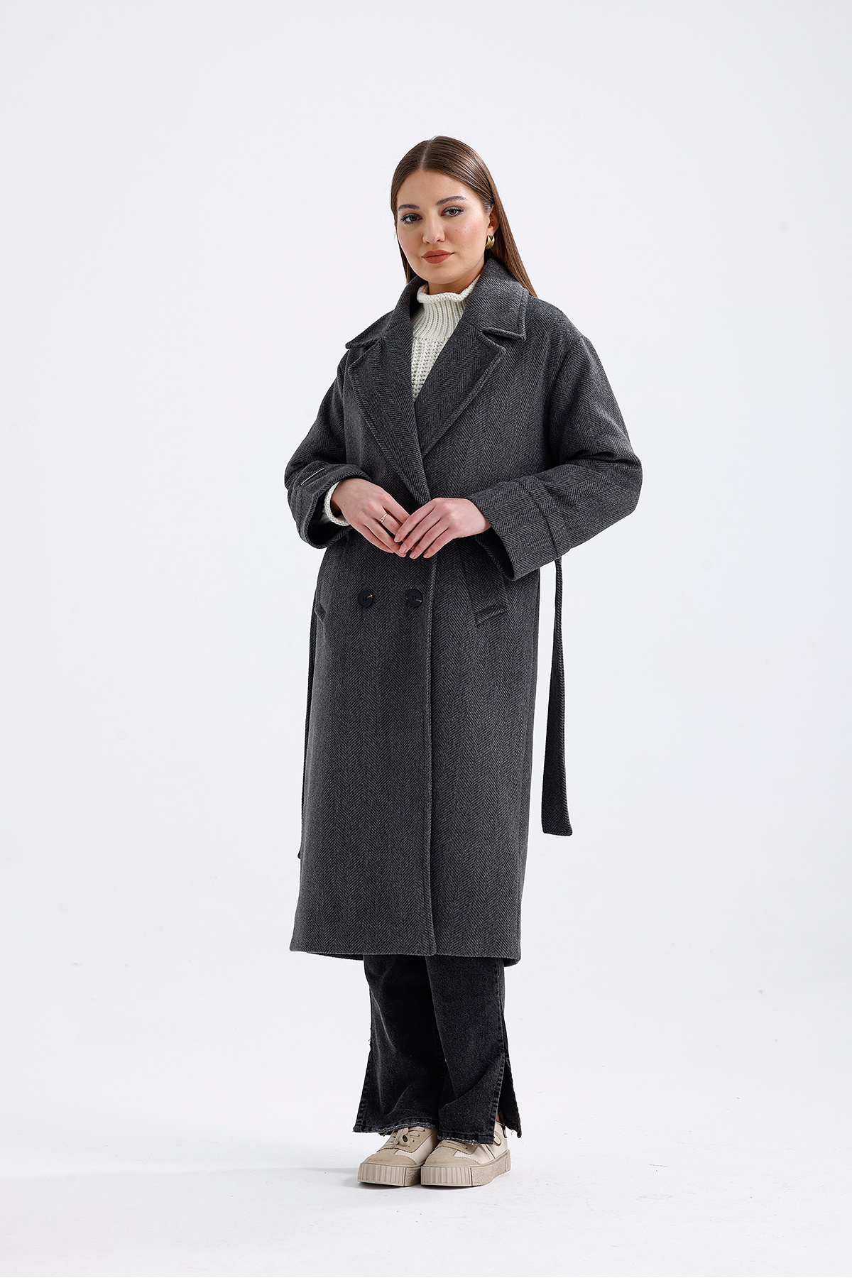 Antrasit rengiyle şıklığı ve zarafeti ön plana çıkaran bu uzun kaban, her ortamda dikkat çekici bir görünüm sunar.