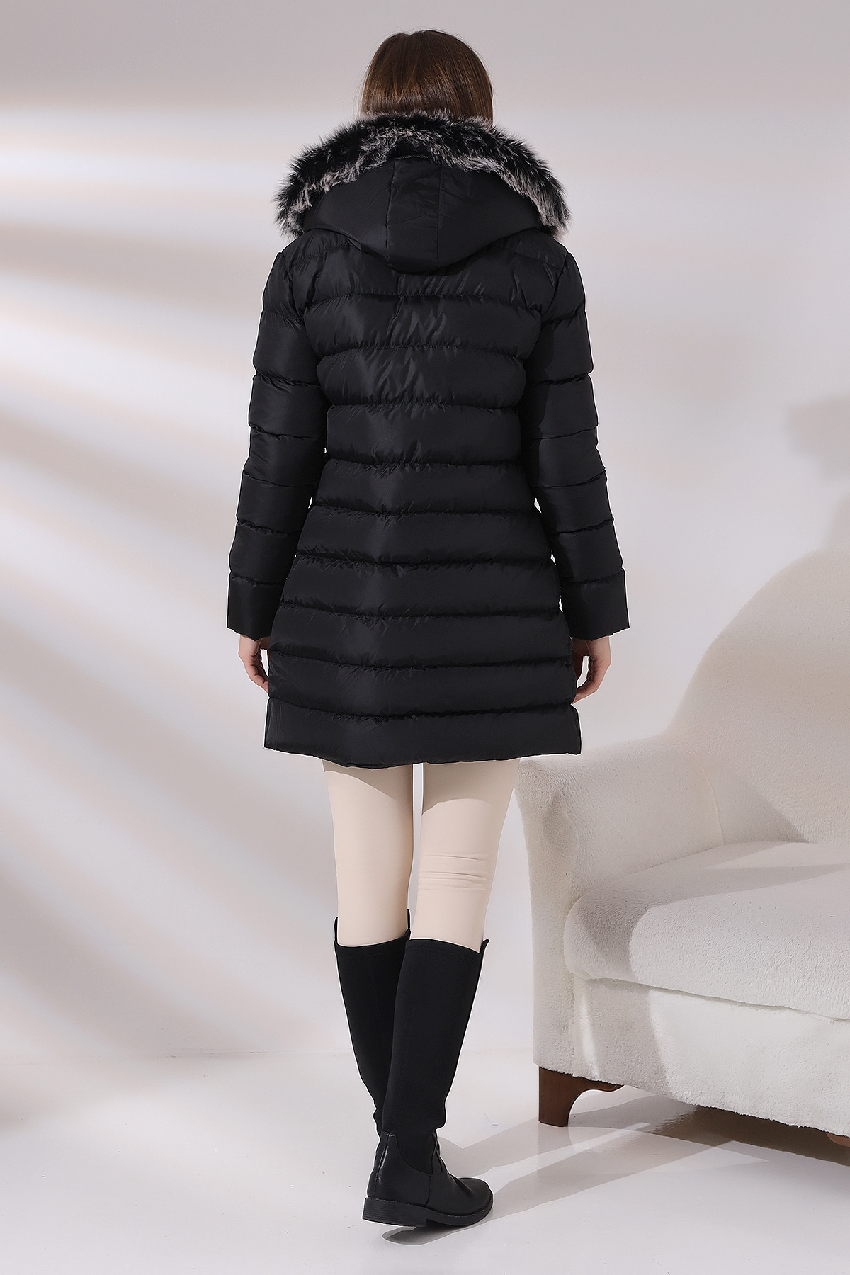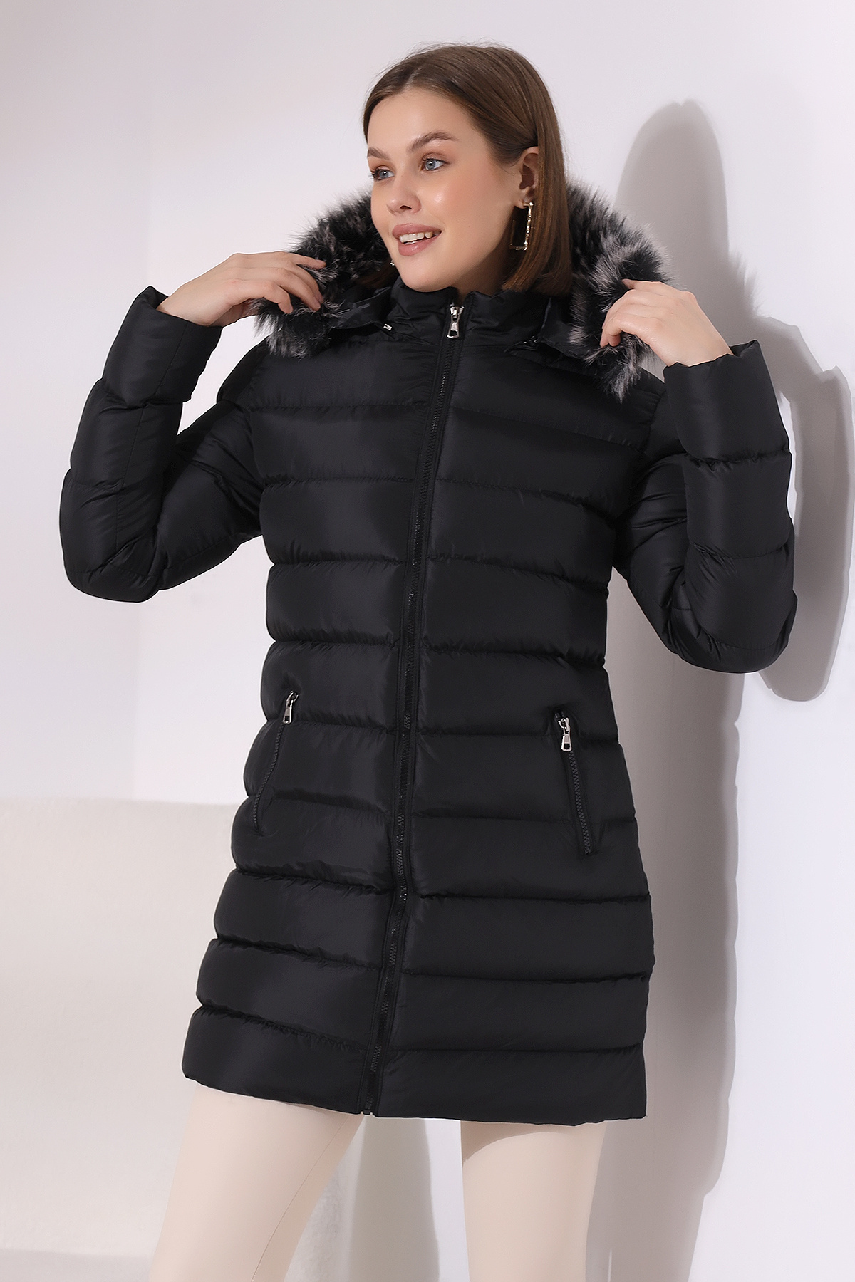 - Rahat kesimi ile günlük kullanım için ideal, siyah renkli kapüşonlu mont.
