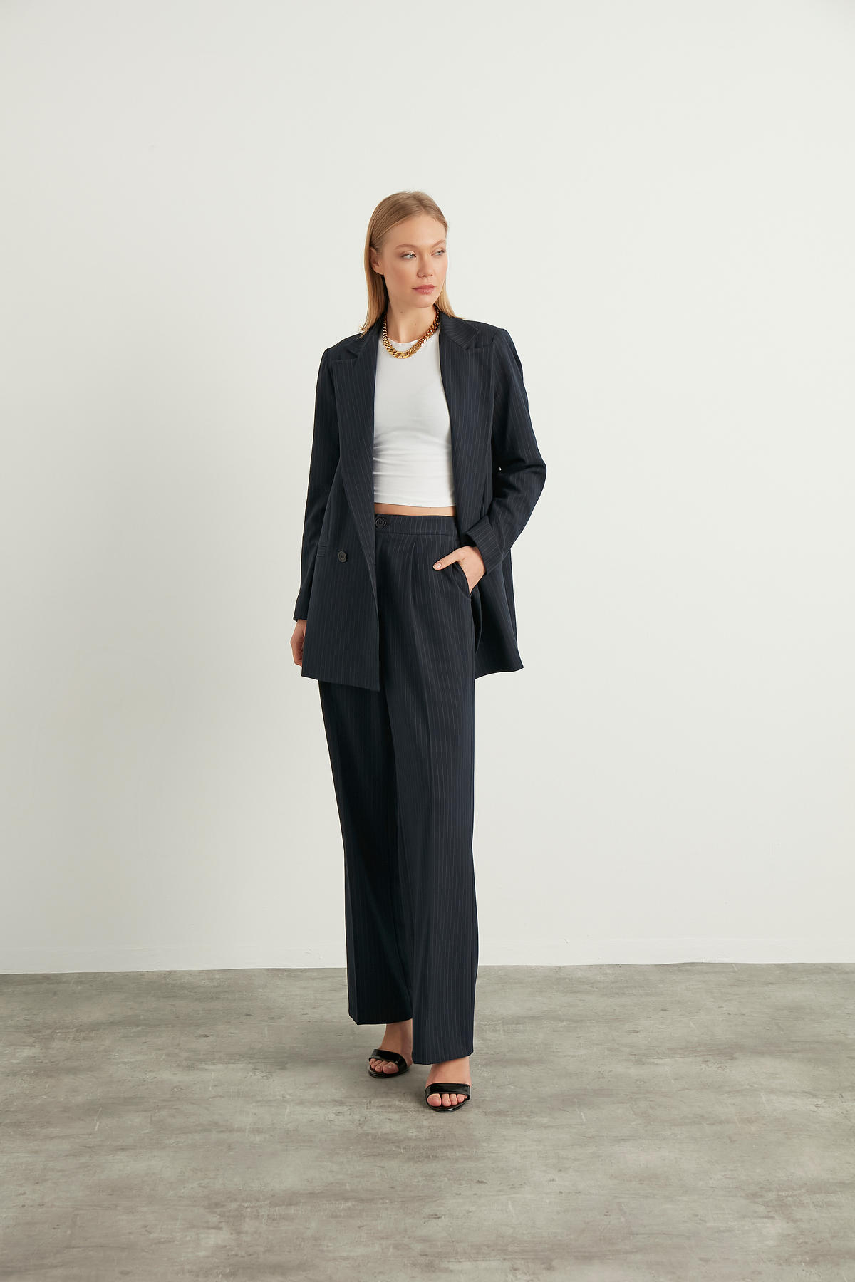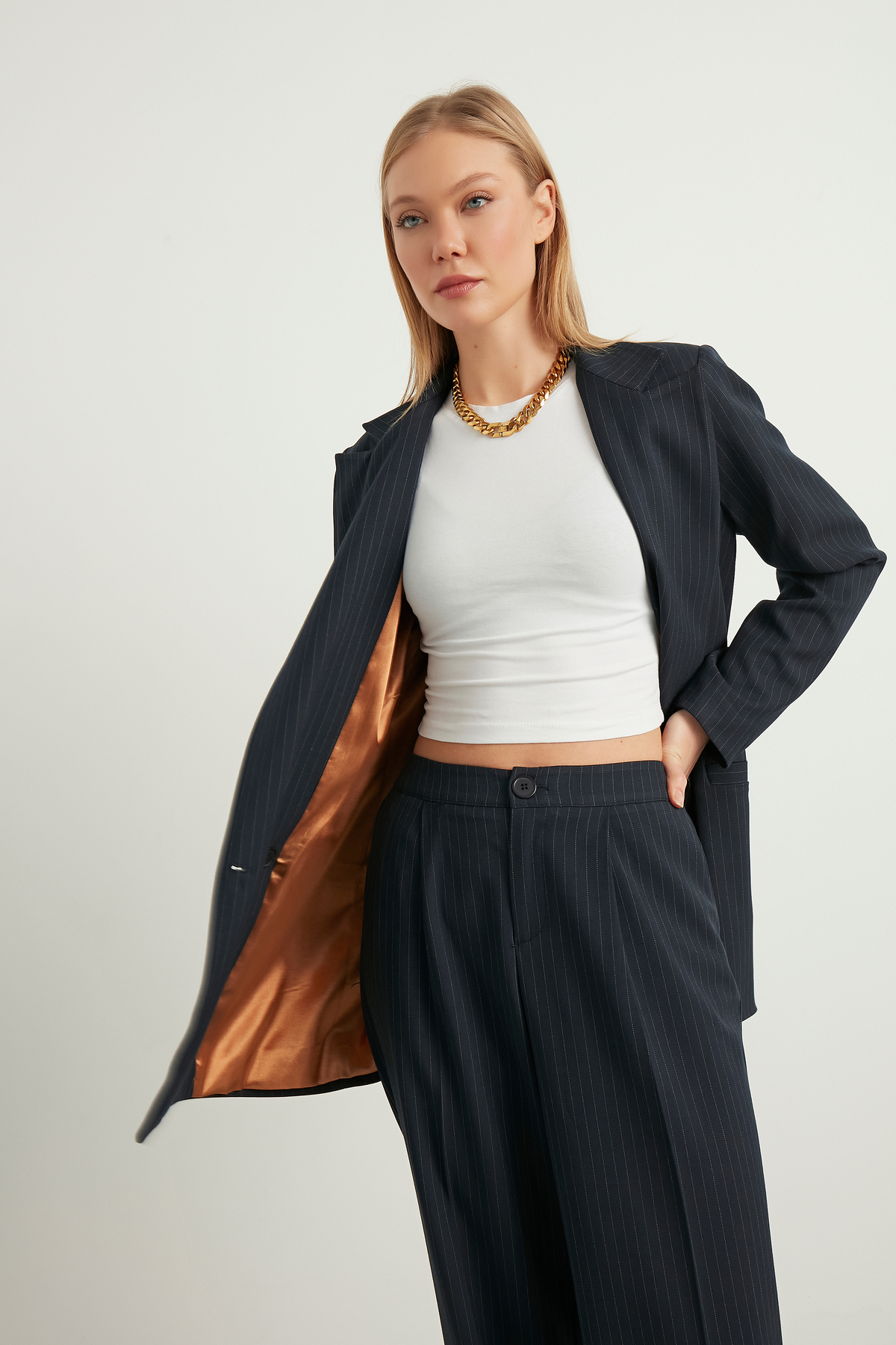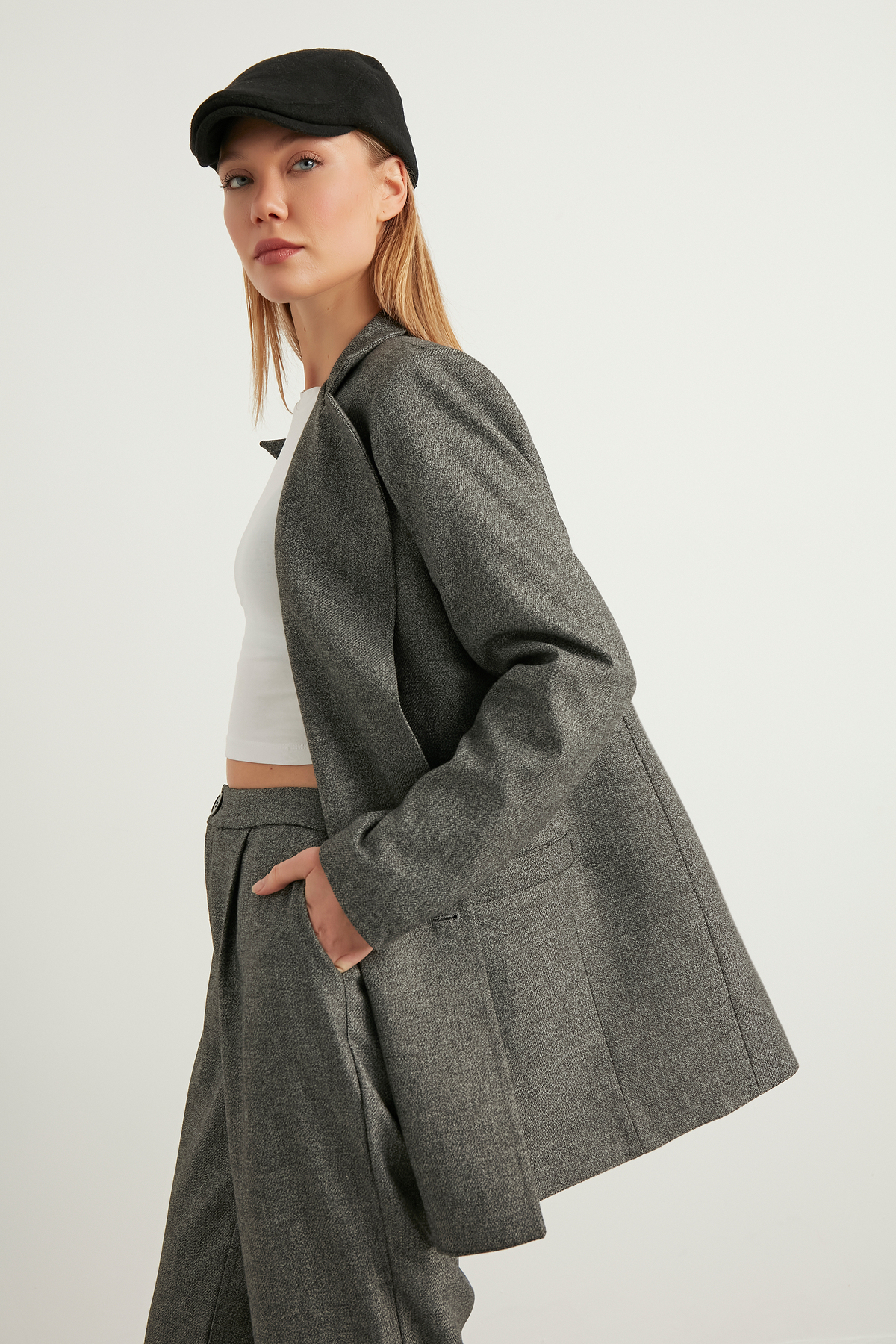 Orta kalınlıkta kumaşı, mevsim geçişlerinde ideal konforu sunarken, katmanlı giyim için de uygundur