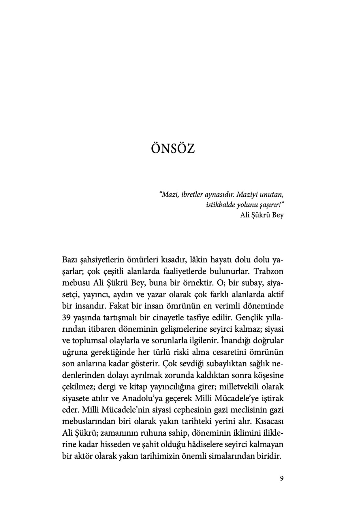 Peki onun bu şüpheli ölümünün ardında yatan gerçek neydi? Bu âdi bir cinayet miydi, siyasî bir suikast miydi yoksa memleketi karıştırmak isteyen ecnebilerin nifak planı mıydı? Elinizdeki kitap, 39 yıllık kısa hayatını asker, muharrir ve mebus kimliğiyle dolu dolu geçiren Ali Şükrü Bey’in öldürülmesiyle ilgili tartışmaları ele almakla birlikte, onun entelektüel ve aksiyoner yönünü de ortaya koyuyor.