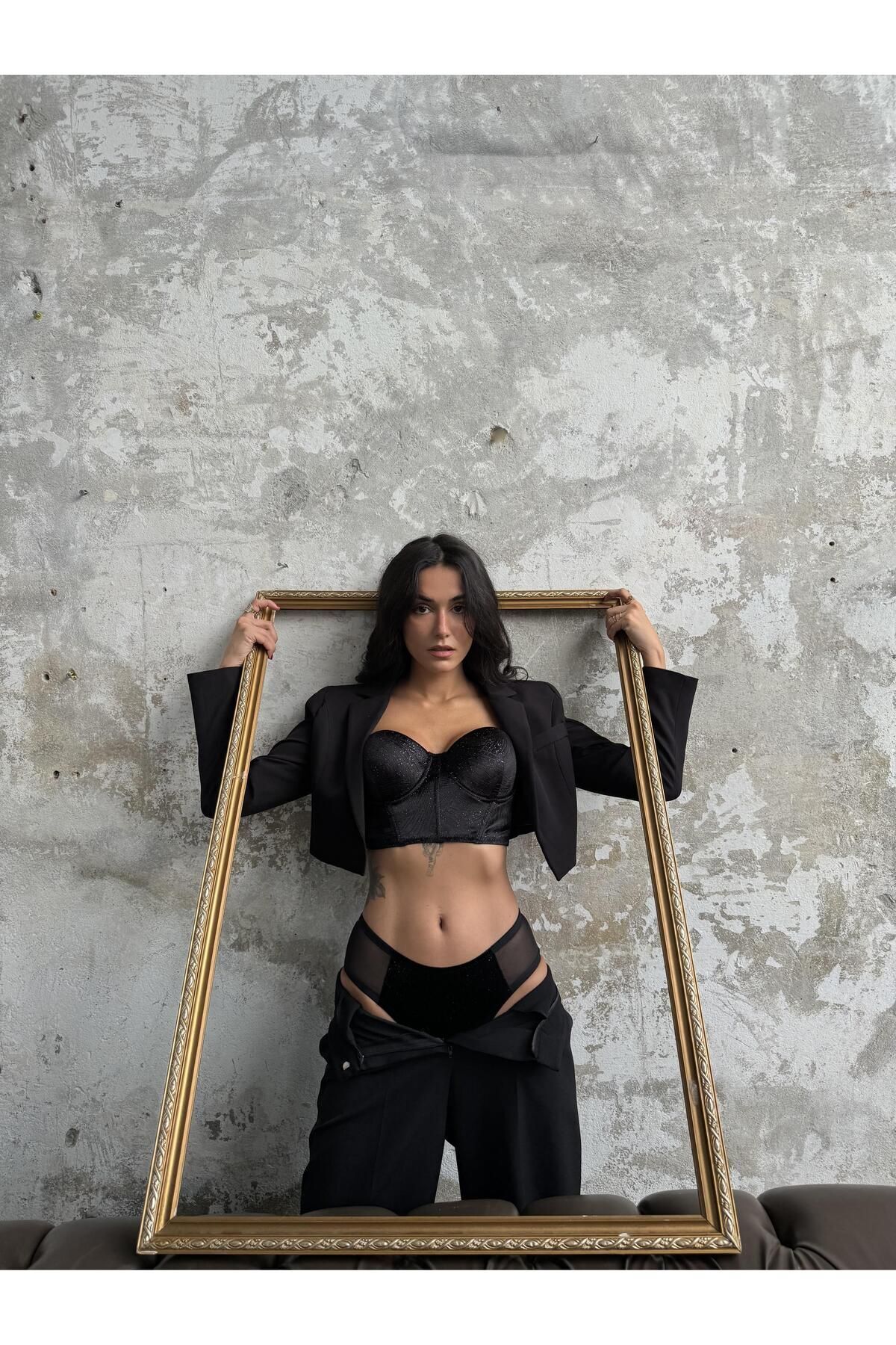 - Zarif kadife dokusuyla, Eros Bustiyer Takım'ın yumuşak yapısı hem konforlu hem de şık bir görünüm sunar.