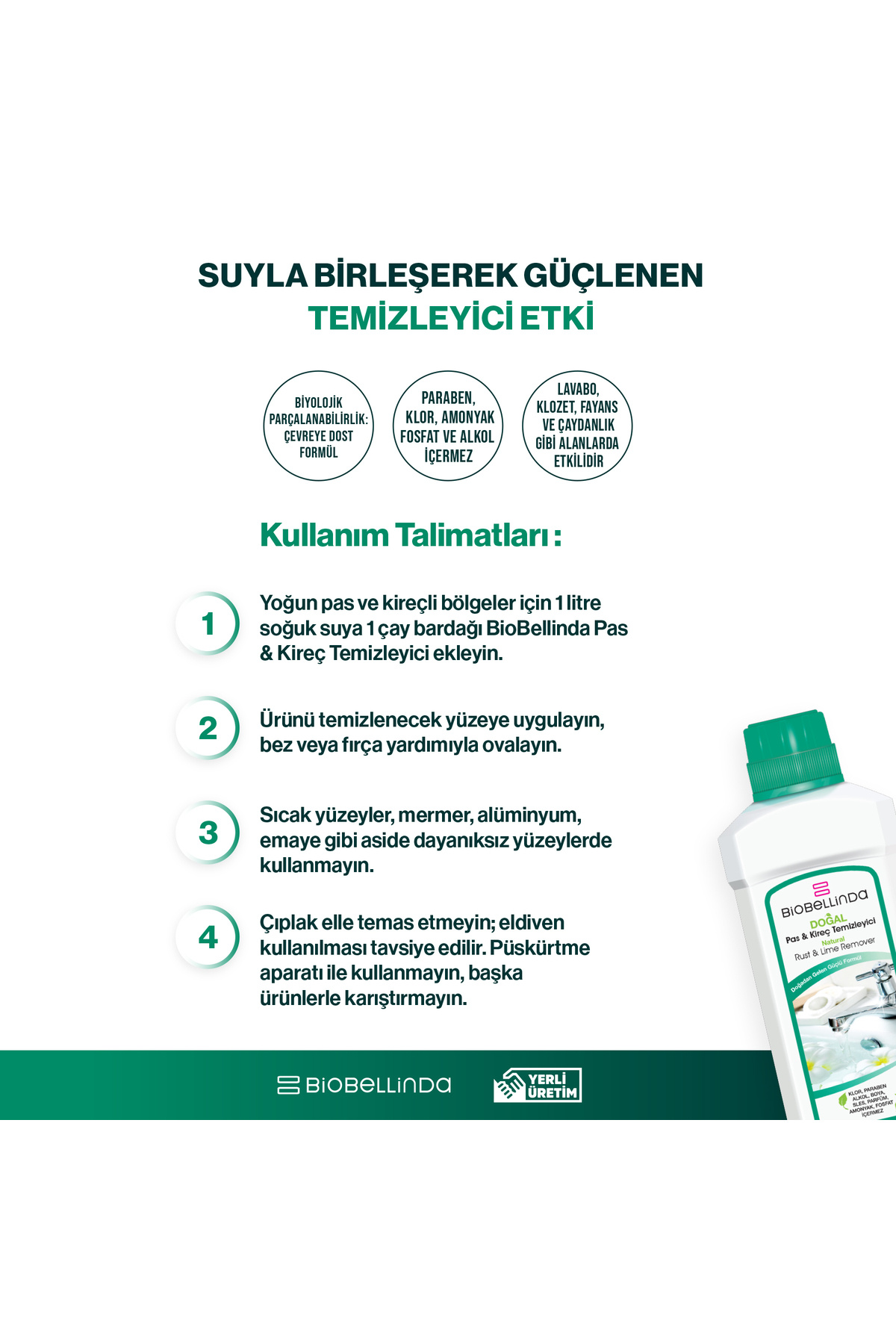 Etkili bir formüle sahip olan BioBellinda Pas & Kireç Temizleyici'yi tercih ederek hijyen yaratabilirsiniz.