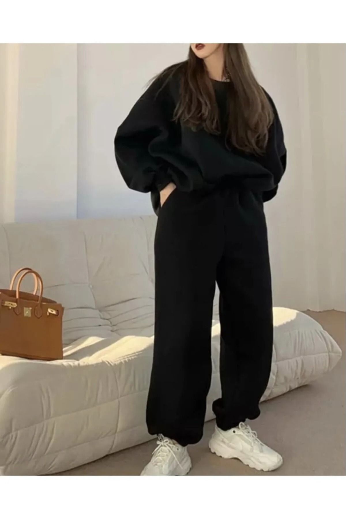 Kış aylarında sıcak tutan ve rahat bir kullanım sunan yuvarlak yaka tam oversize salaş sokak stili kadın eşofman takımı