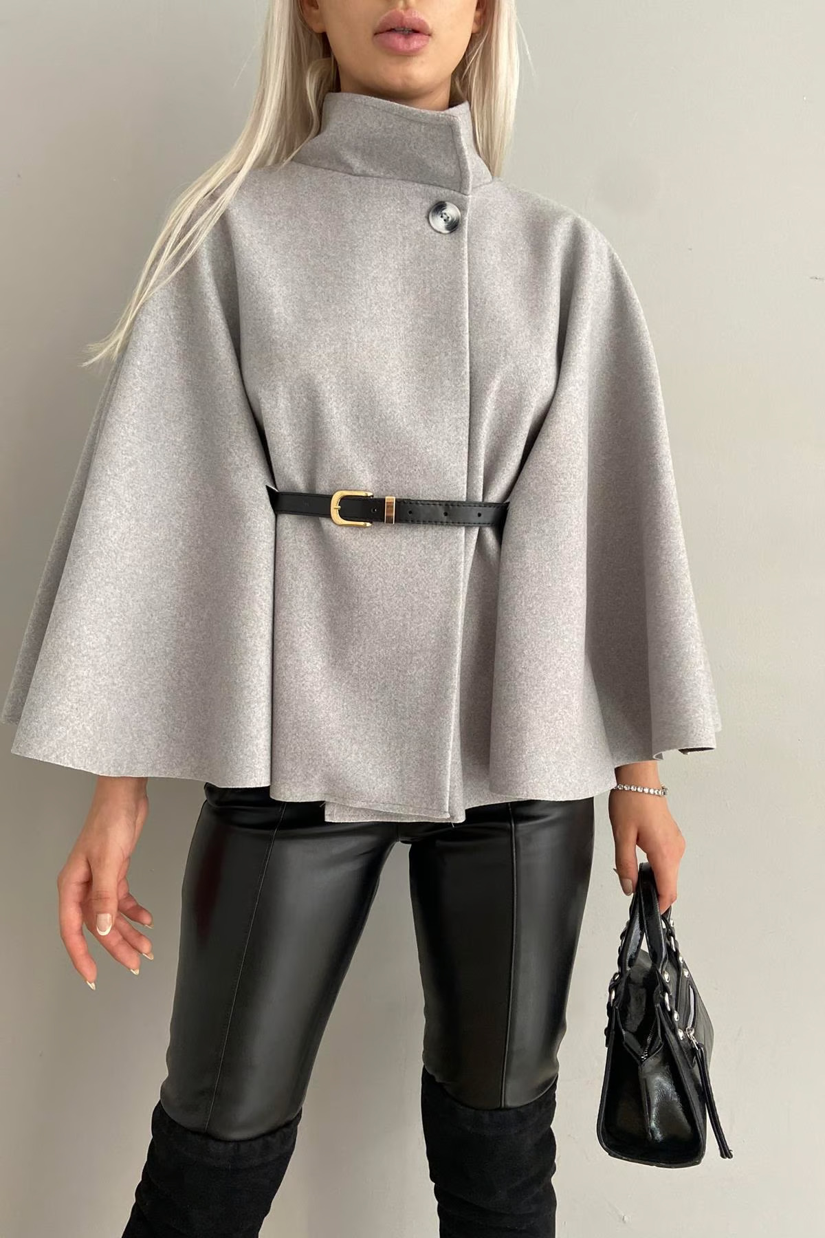 Rahat ve şık bir görünüm için tasarlanmış hakim yaka kemer detaylı kaşe panço, günlük kullanımın vazgeçilmez parçası