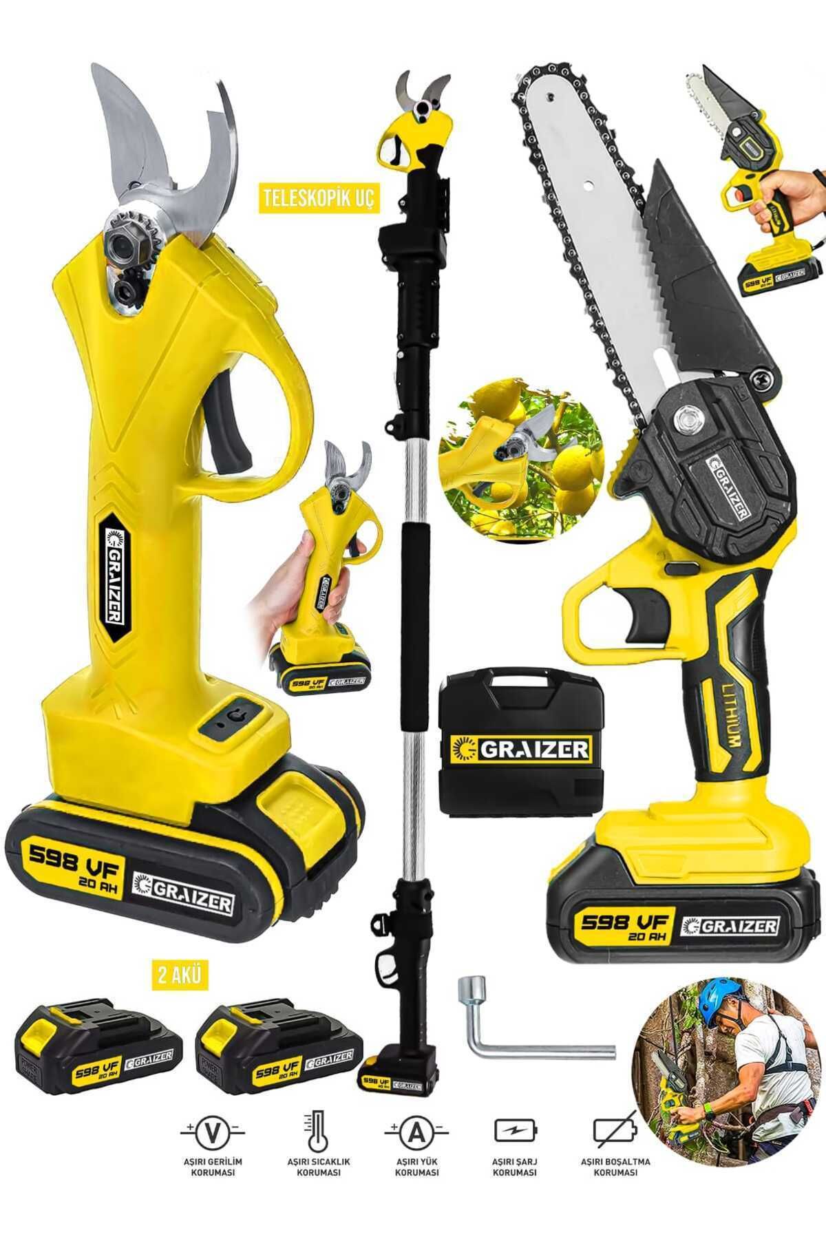 2.7 METRE TELESKOPIK UZATMA HEDIYELI ALMAN GRAIZER 598 Vf 2 li SET MAKAS AKÜLÜ DAL TESTERE BUDAMA 2 AKULU Değerli müşterimiz ürün Stok durumuna Göre renk değişebilir Daha hızlı sonuç – Akülü budama sayesinde verimlilikte yeni seviye Meyve ağaçlarını budamak için ideal seçim Manuel budama makaslarıyla kıyaslandığında çok daha az çabayla düzgün budama Güçlü Lityum İyon akü sistemi tek bir şarj ile maksimum 2000 kesim yapabilir (Graizer - Pasifik Ar-Ge Laboratuarı tarafından test edilmiştir) Korozyona dayanıklı ve uzun ömürlü bıçakları uzun kullanim ömrü sunar Akü hariç ağırlığı 1,2 kg • Ahşapta maks.