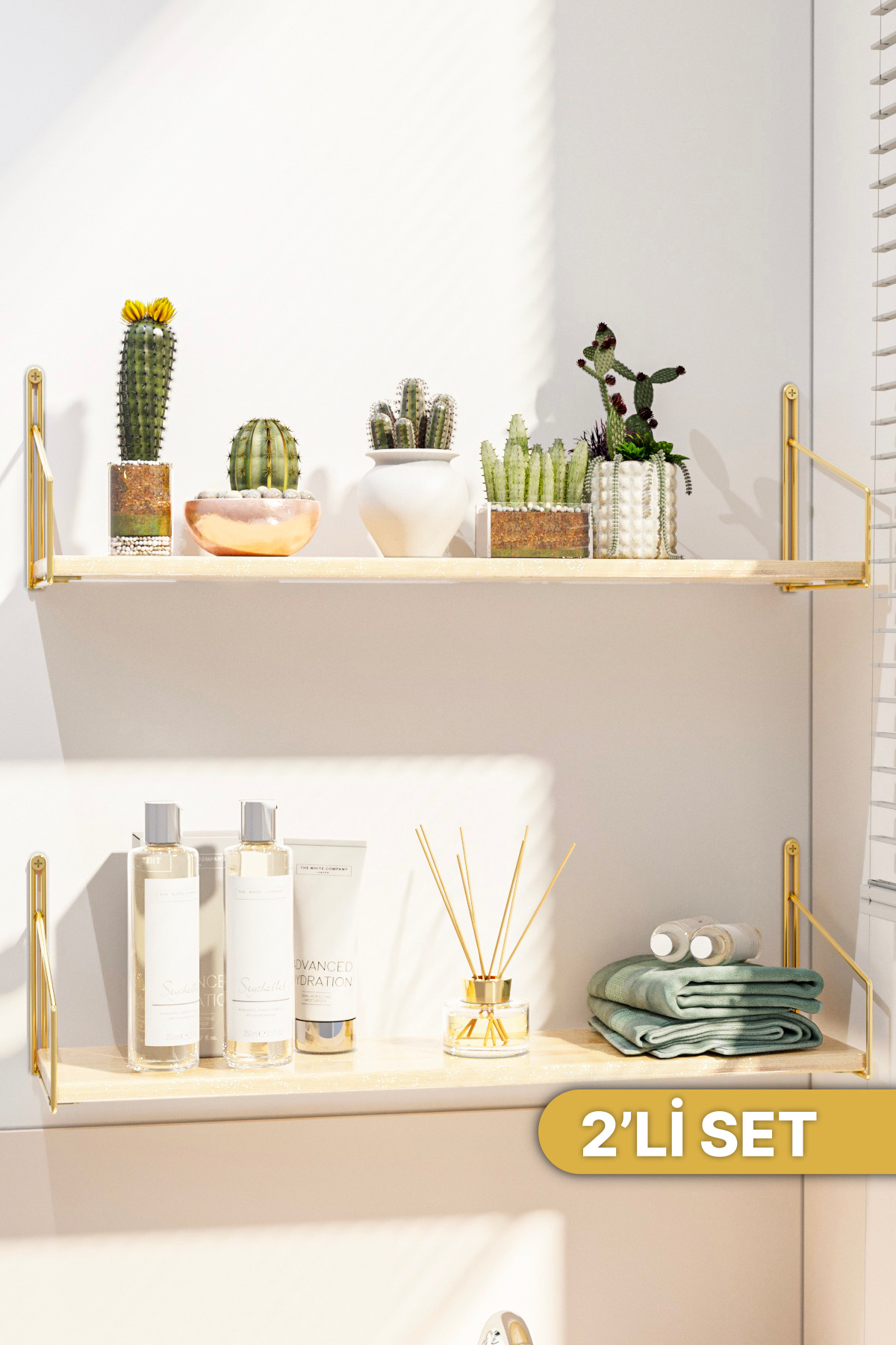 Bino Mutfak Rafı Duvar Rafı Parlak Gold Kaplama Masif Ahşap Raf 2li Set Lüks Dekoratif Banyo Antre Raf