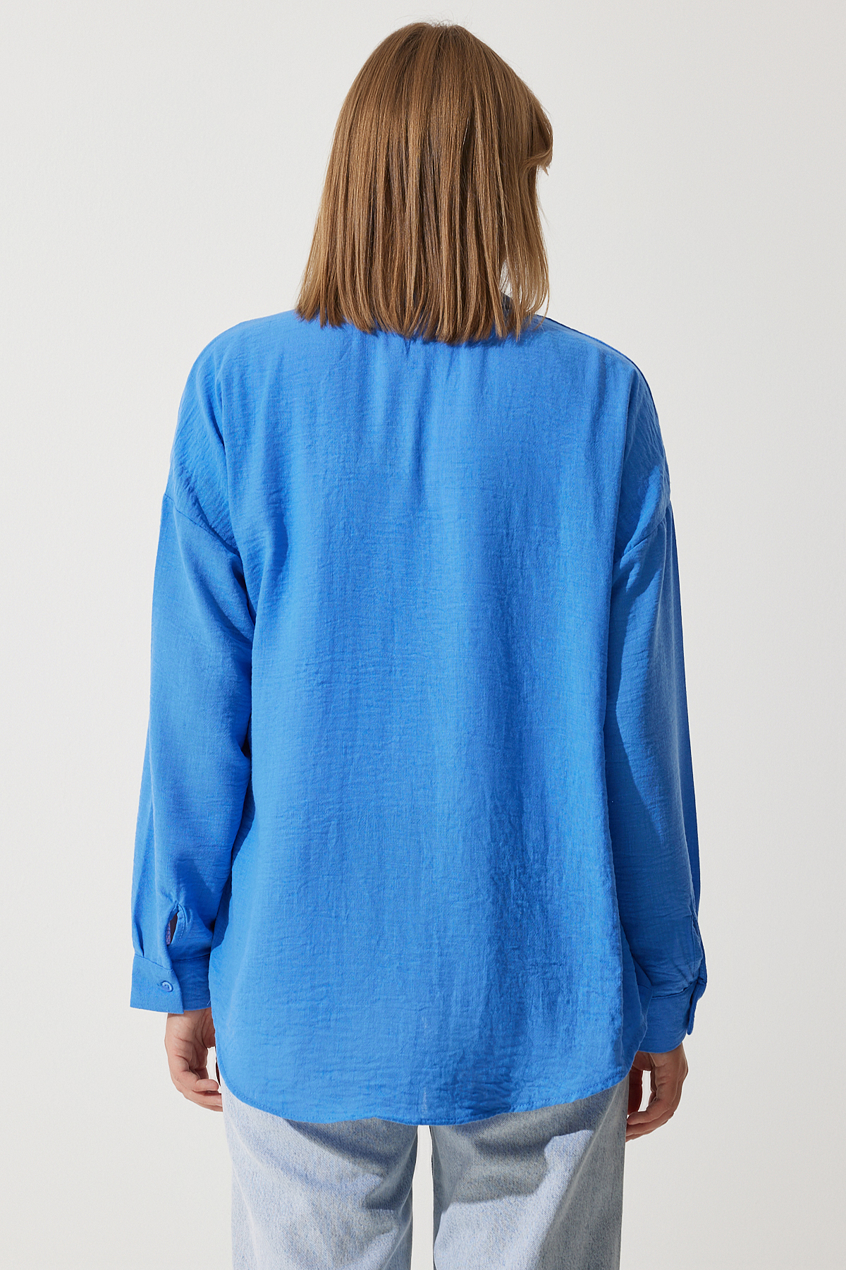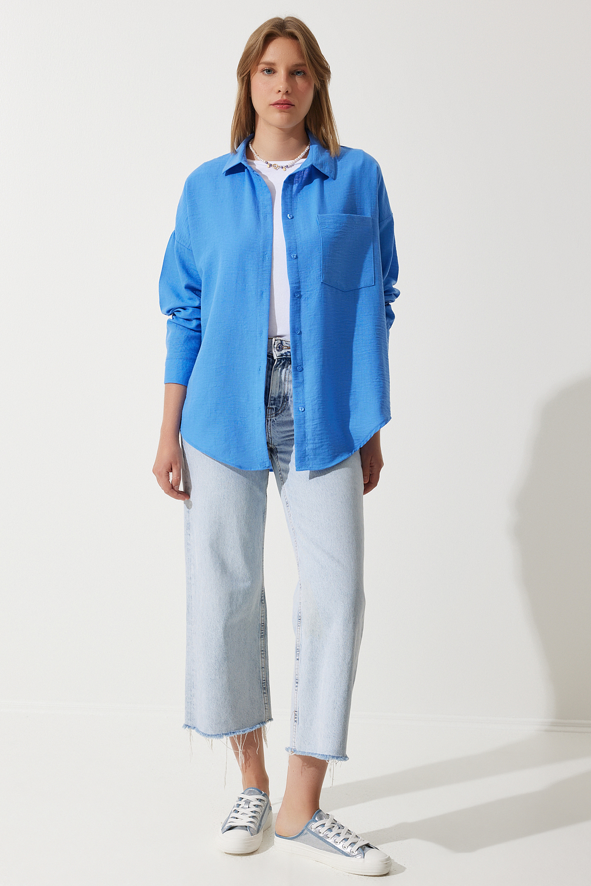 Günlük kullanıma uygun tasarımıyla rahatlığı ve şıklığı bir arada sunan mavi oversize keten gömlek, casual ortamlarda vazgeçilmez bir parça haline gelir
