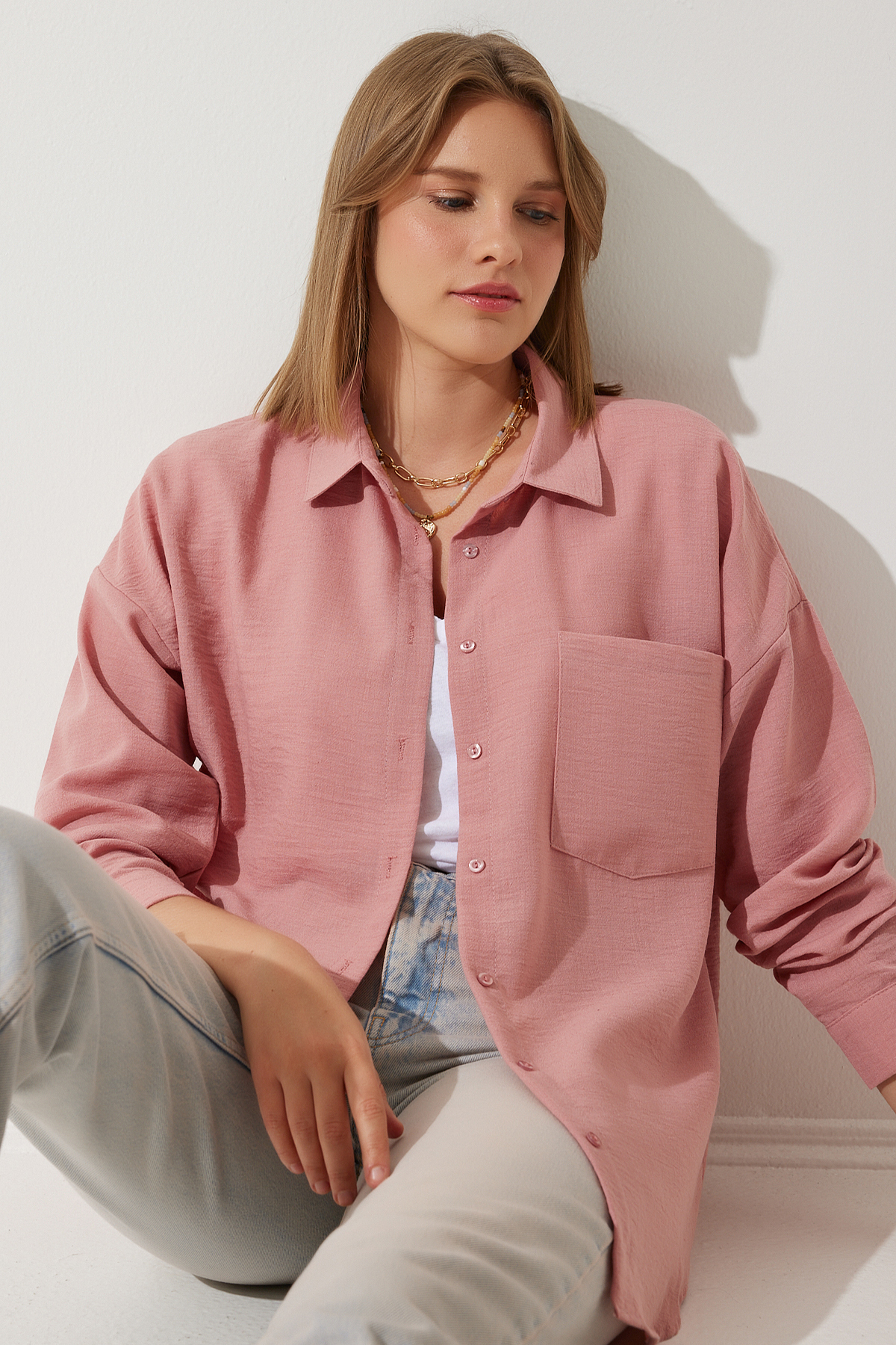 Günlük kullanıma uygun tasarımıyla rahatlığı ve şıklığı bir arada sunan mavi oversize keten gömlek, casual ortamlarda vazgeçilmez bir parça haline gelir
