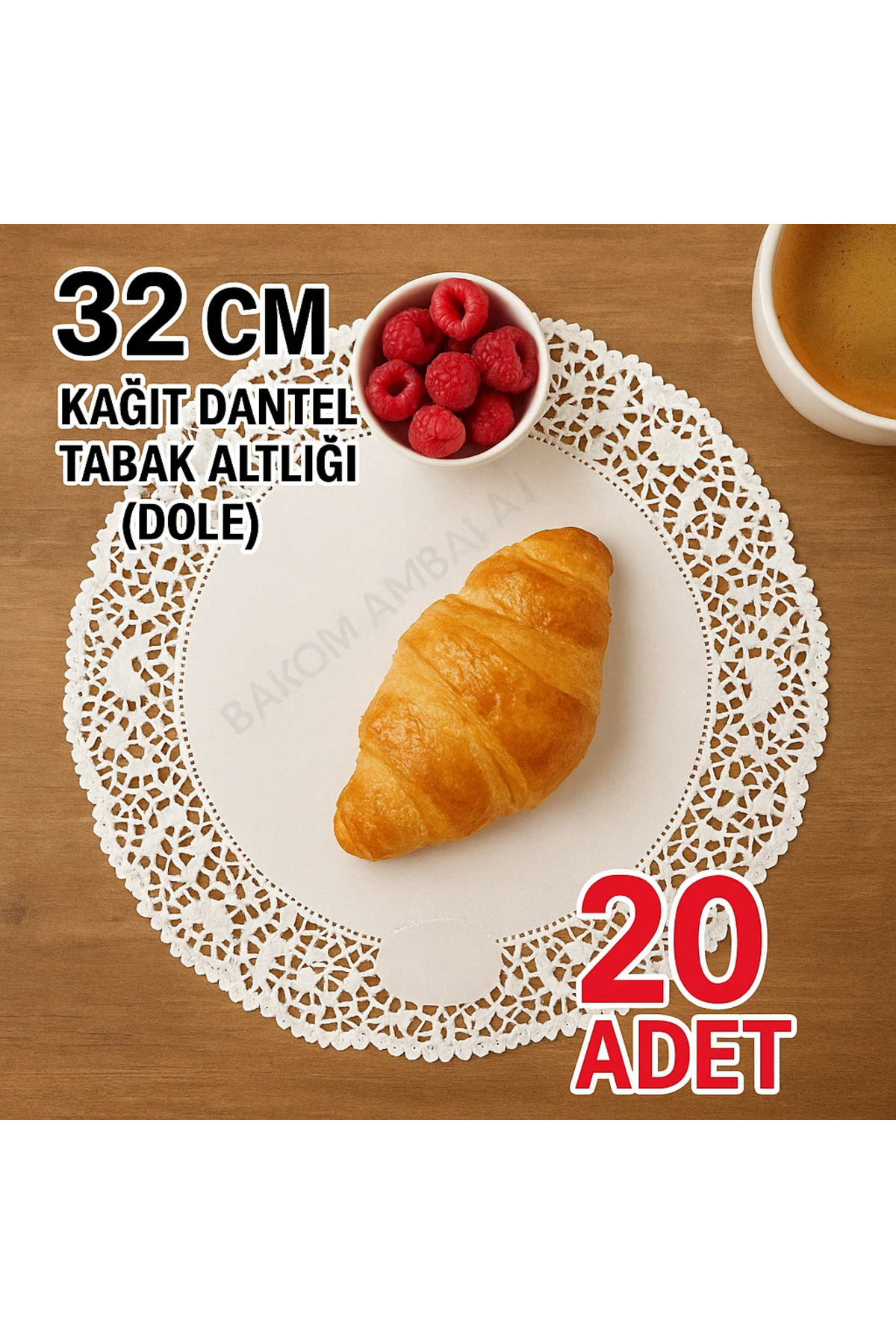 **Bakom Ambalaj 32 cm Kağıt Dantel Tabak Altlığı - 20 Adet** Bakom Ambalaj'ın özel tasarımıyla dikkat çeken kağıt dantel tabak altlıkları, özel etkinliklerinizde masanıza zarafet ve şıklık katıyor.