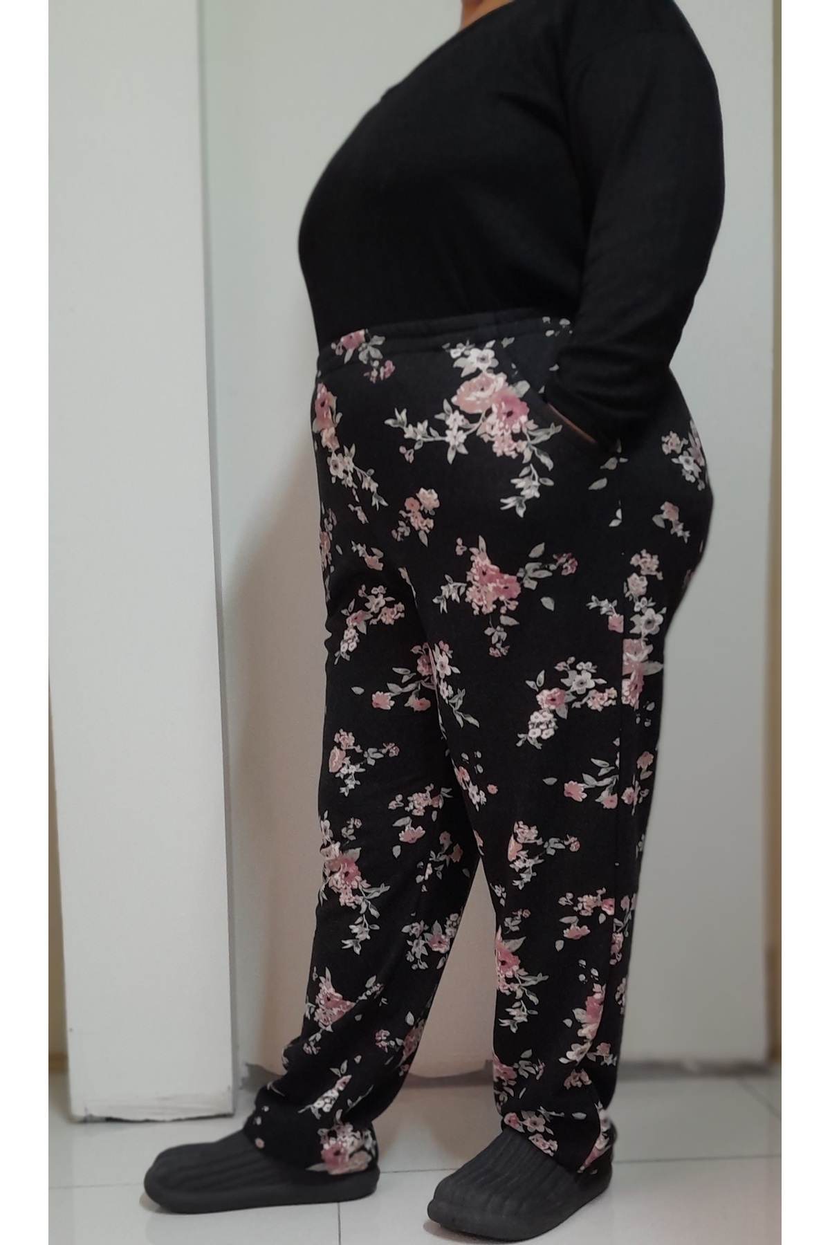 - Günlük kullanım için ideal, rahat ve şık tasarımıyla dikkat çeken siyah çiçekli 3 iplik şardonlu kışlık pijama eşofman altı, evde konforunuzu artırır