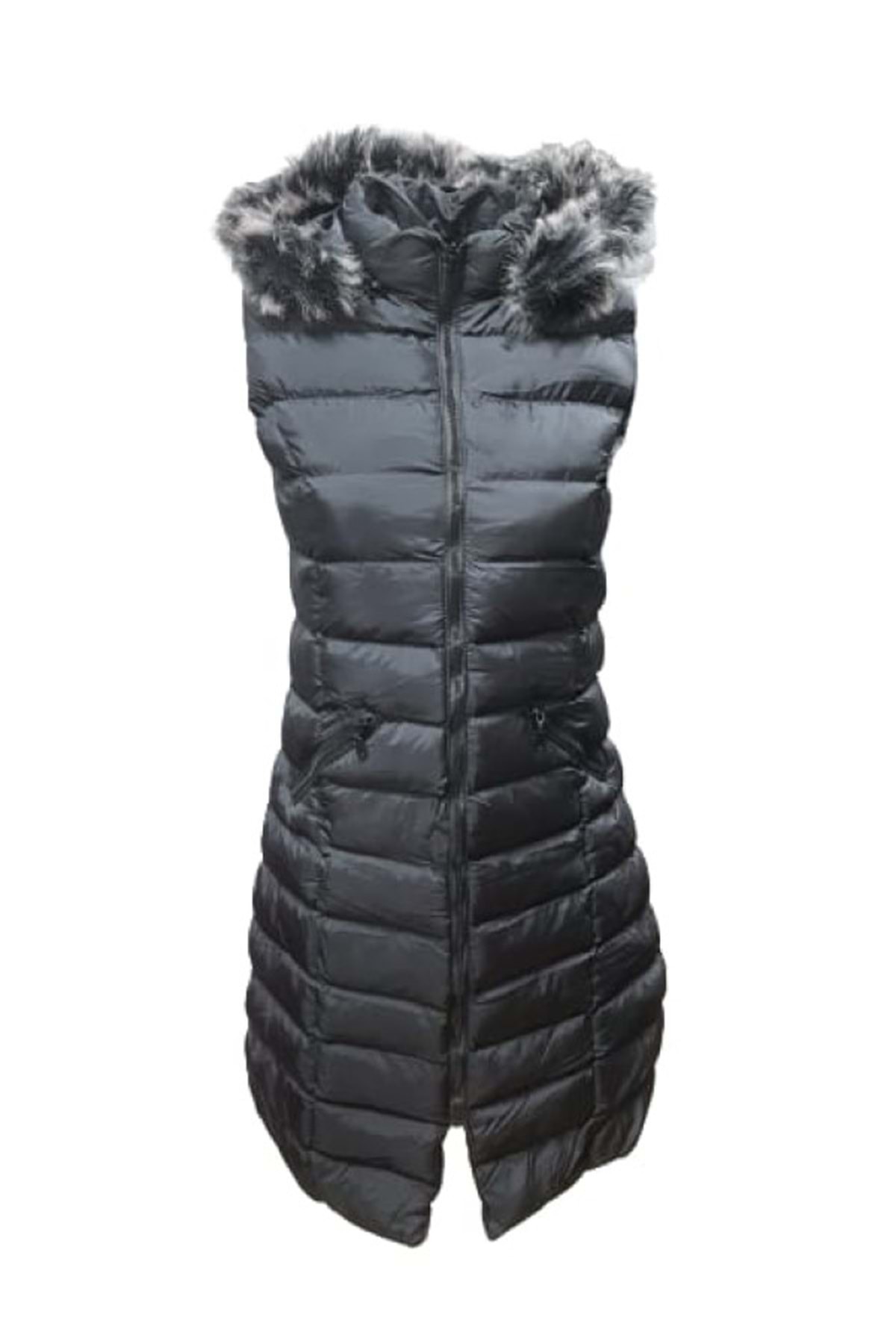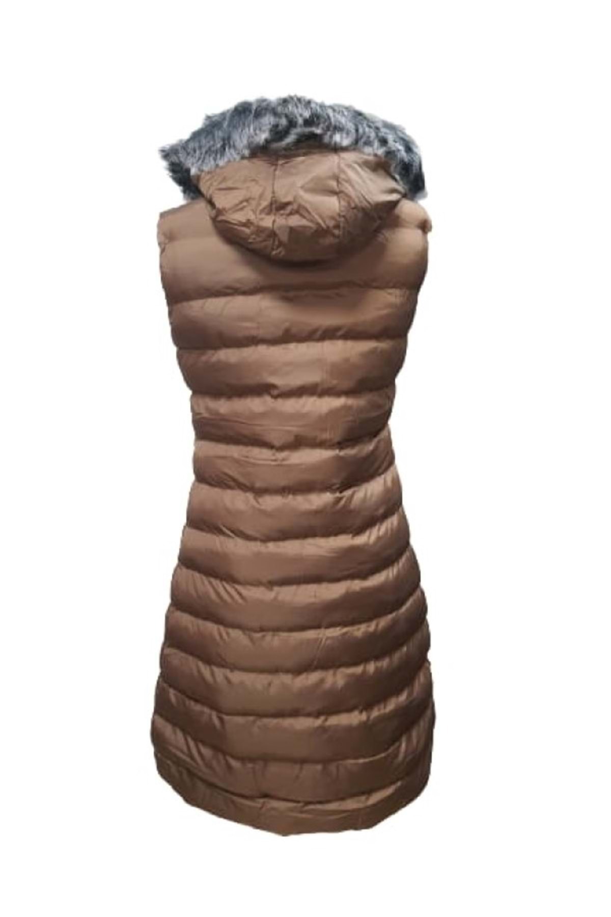 Kapitone dolgu tekniği ile üretilmiş, sıcak tutan ve hafif yapısıyla kış aylarında konfor sunan kadın kapüşonlu kürklü yelek.