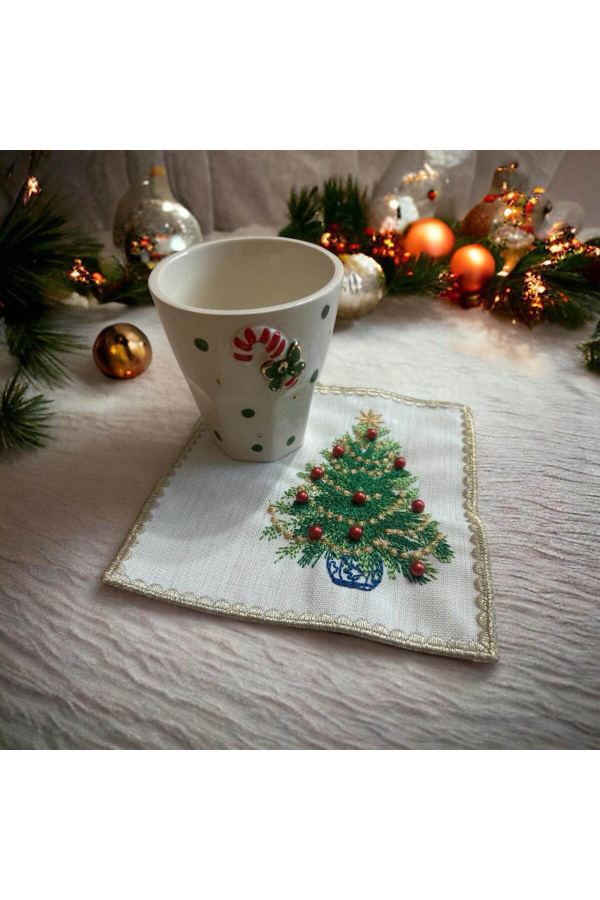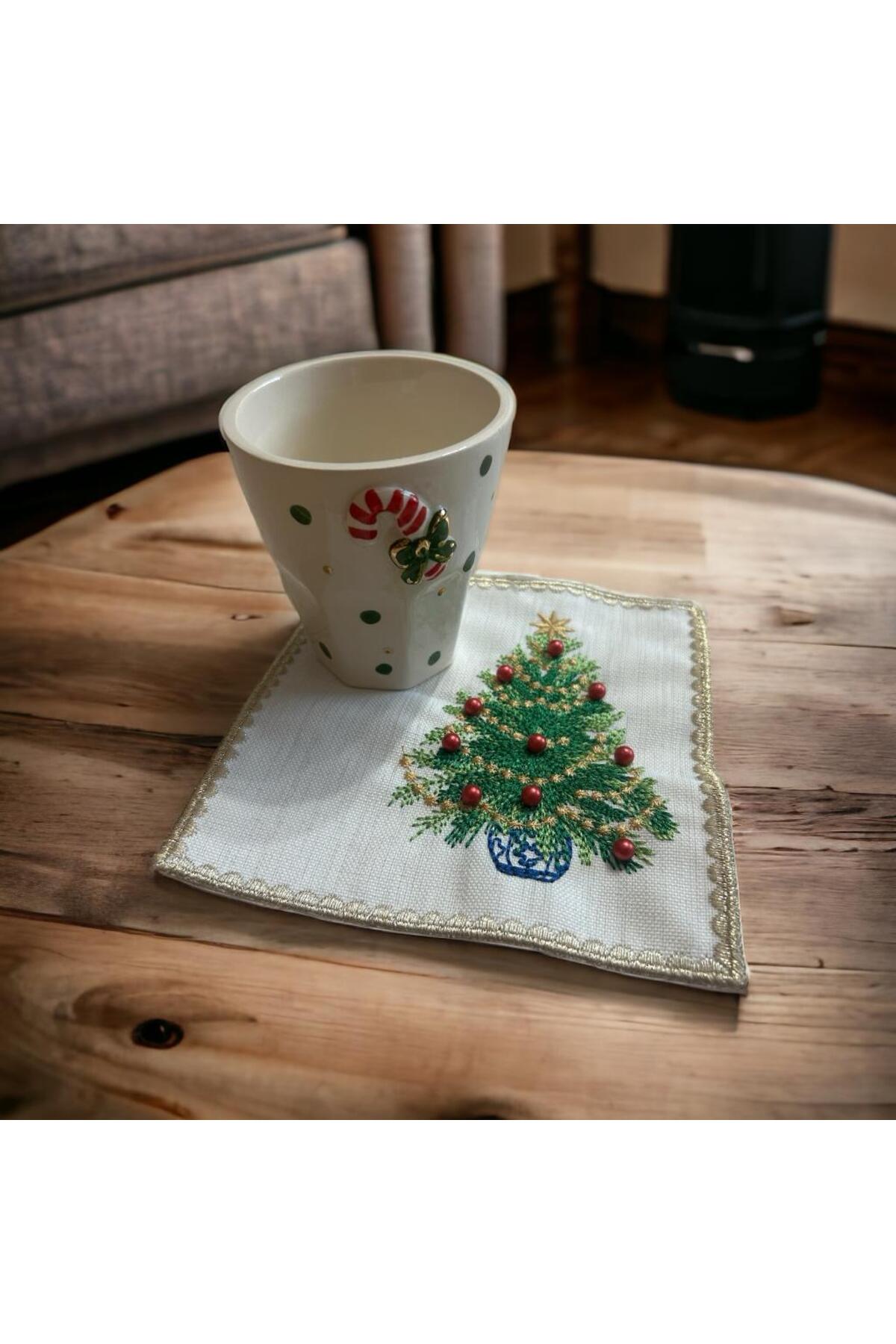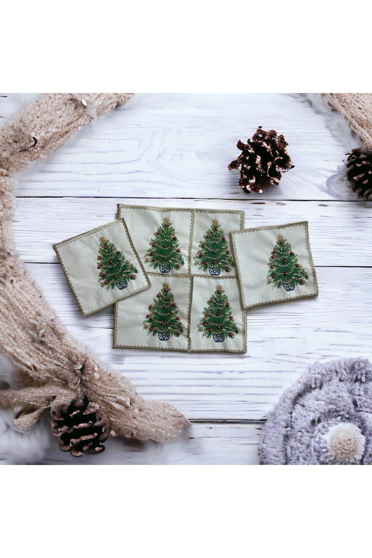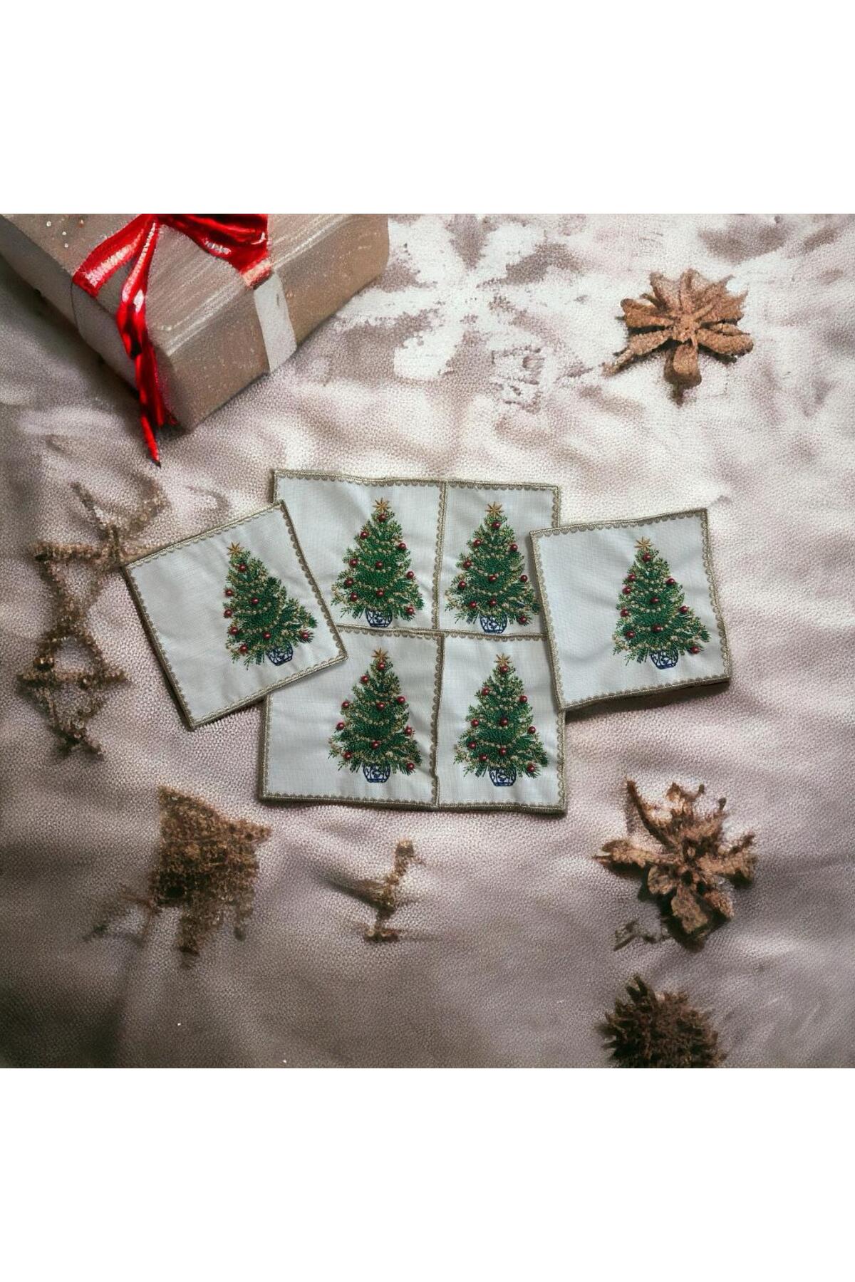 Yılbaşı Çam Ağacı Desen Kırmızı Boncuk Detaylı Nakış Çok Renkli Kokteyl Peçete 2 Adet Bardak Altlığı
