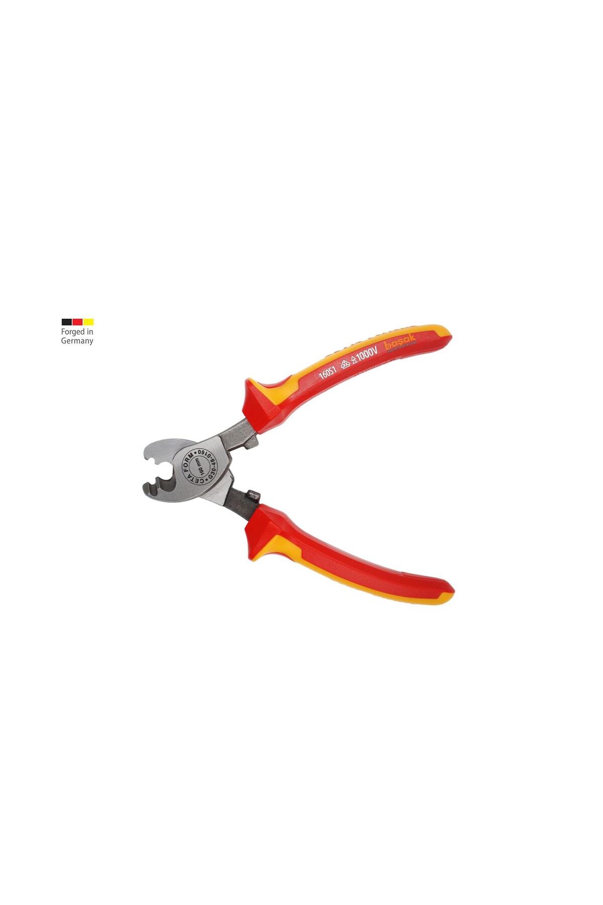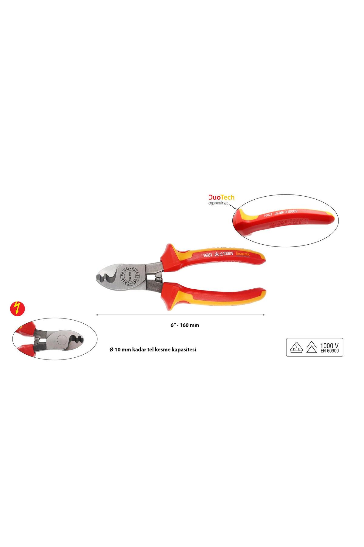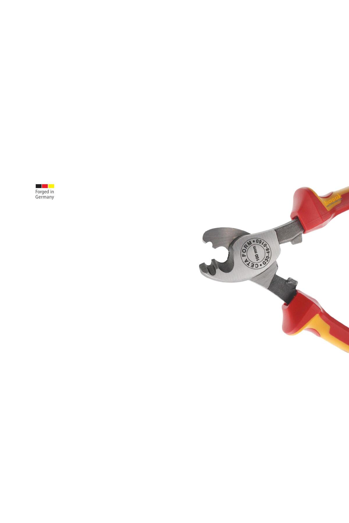 0160 İzoleli Kablo Kesici (VDE Onaylı) 1000V AC ve 1500V DC gerilim izolasyonu Bakır ve alüminyum kabloları kesmek için Elektro vernik kaplı polisajlı yüzey Özel takım çeliği Çift bileşenli ergonomik sap Çelik tel ve çelik halatlar için uygun değildir G30