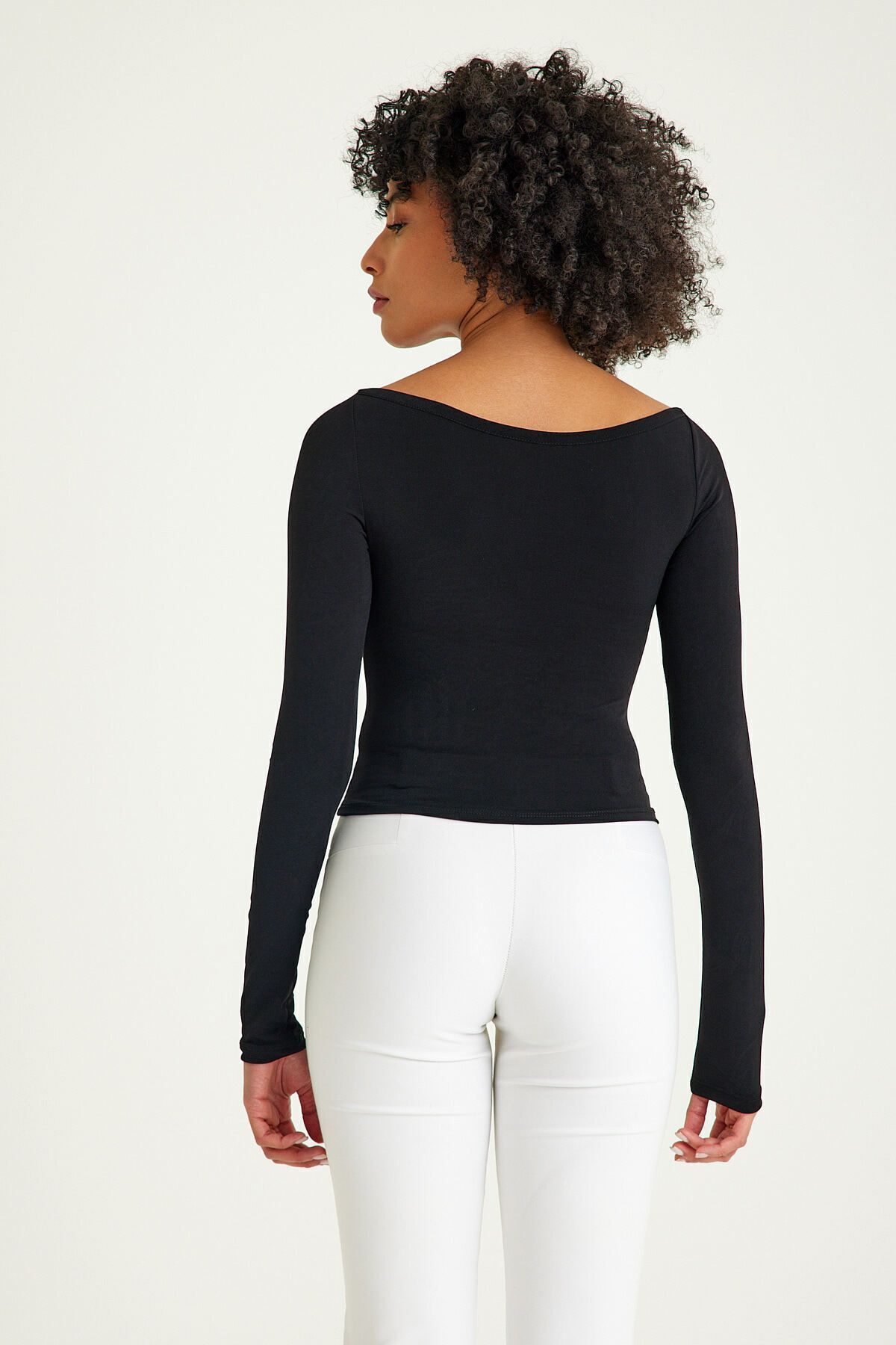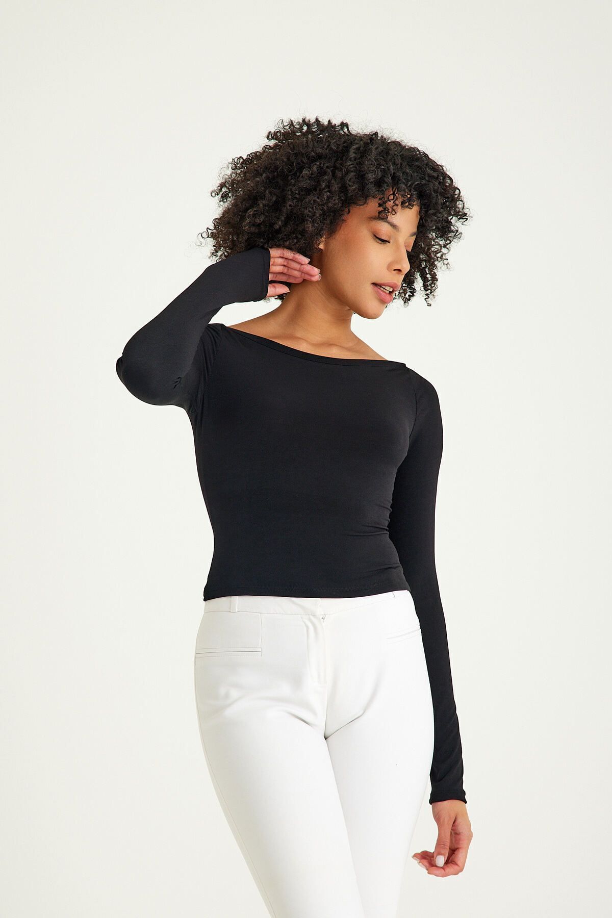 Kayık yaka detayı ile feminen çizgiler ön plana çıkarırken, aynı zamanda farklı aksesuarlarla kombinlenebilirliği artırır.