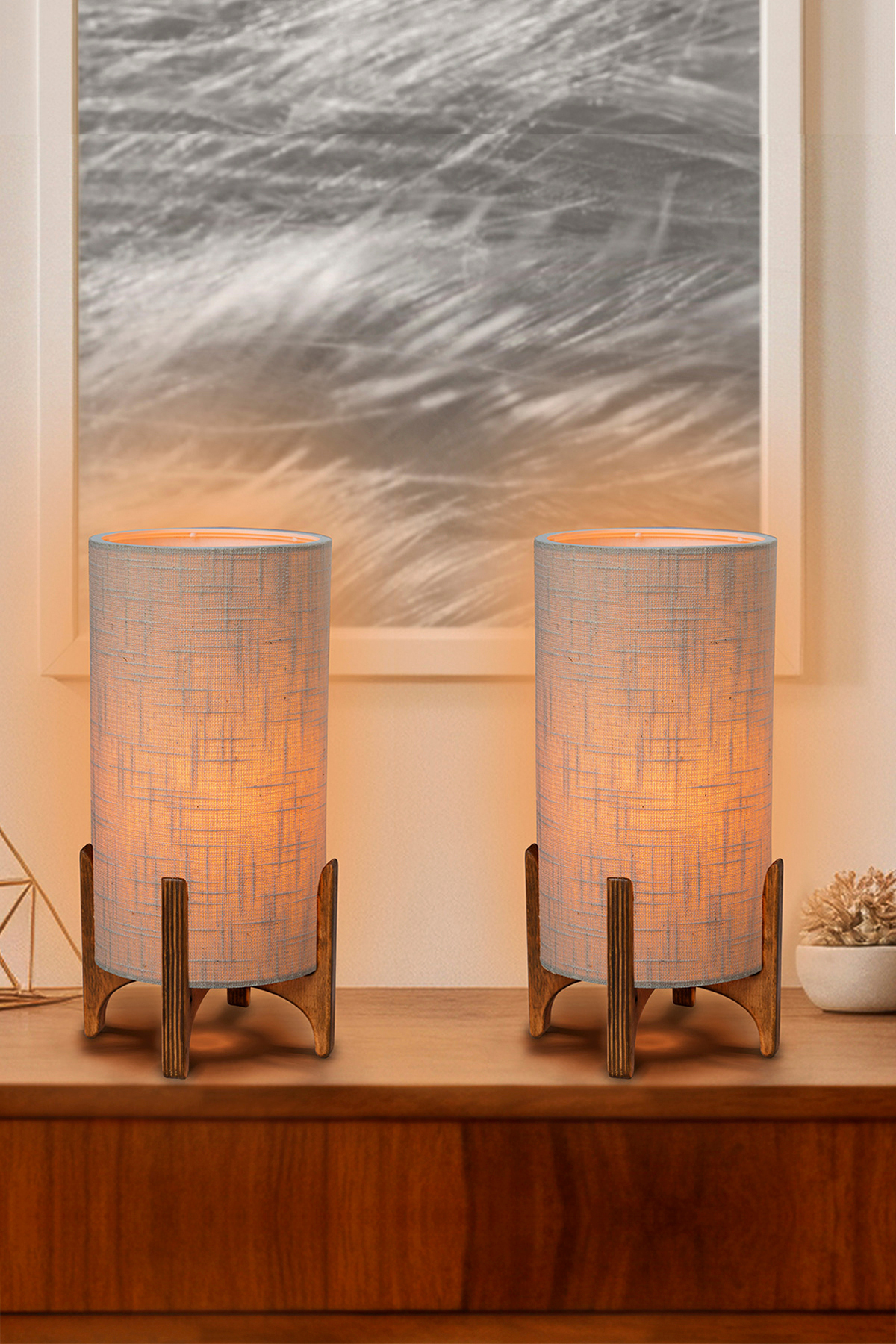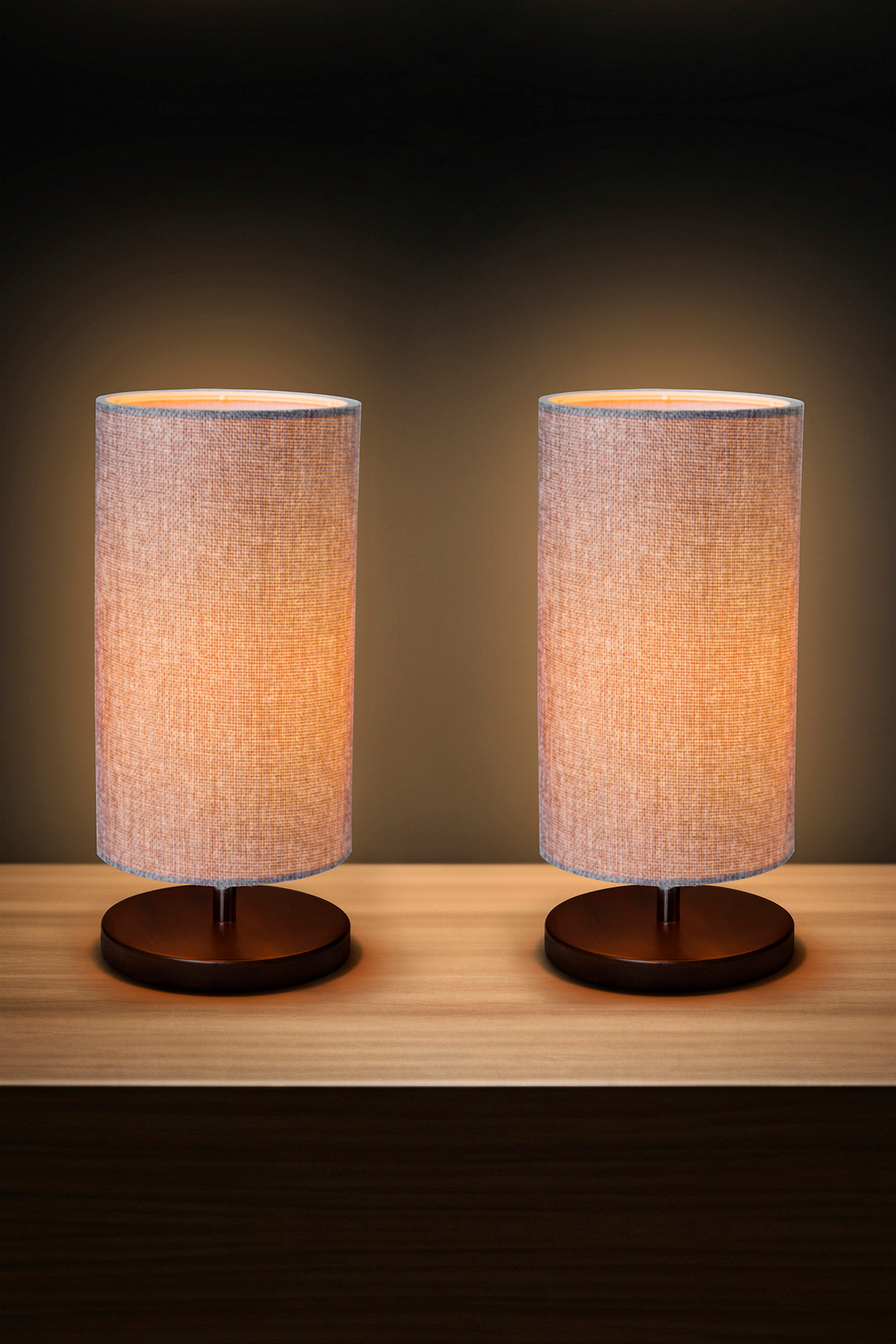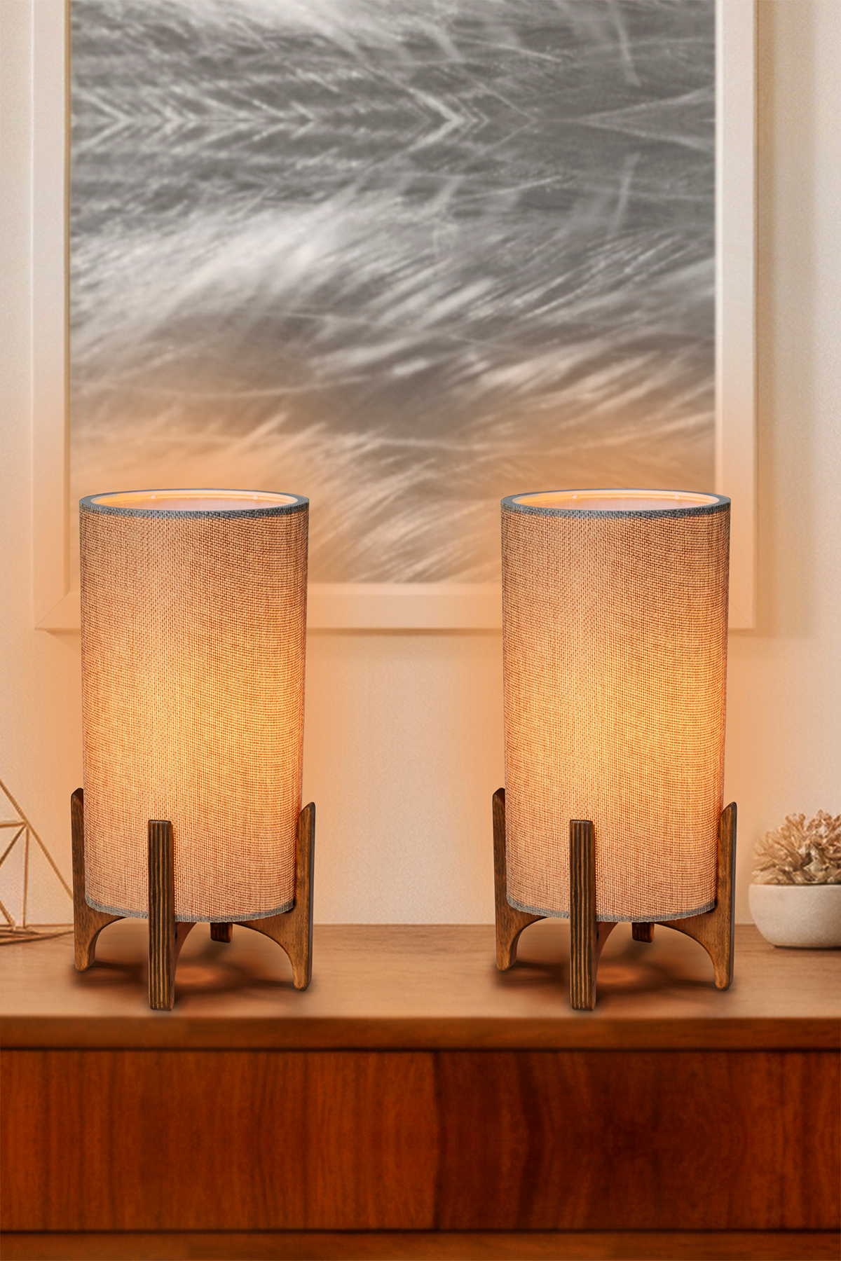 Sağlam doğal ahşap tabanlı, metal gövdeli ve görünür tekstil lifli lamba başlıklı masa lambası.