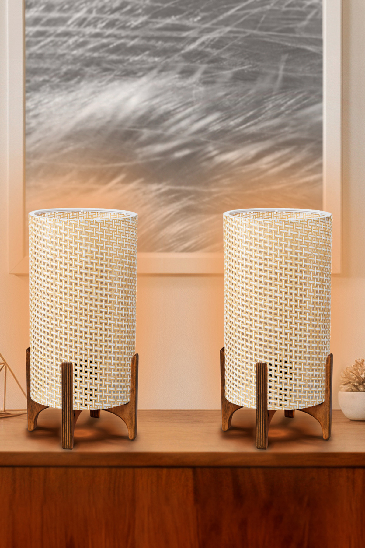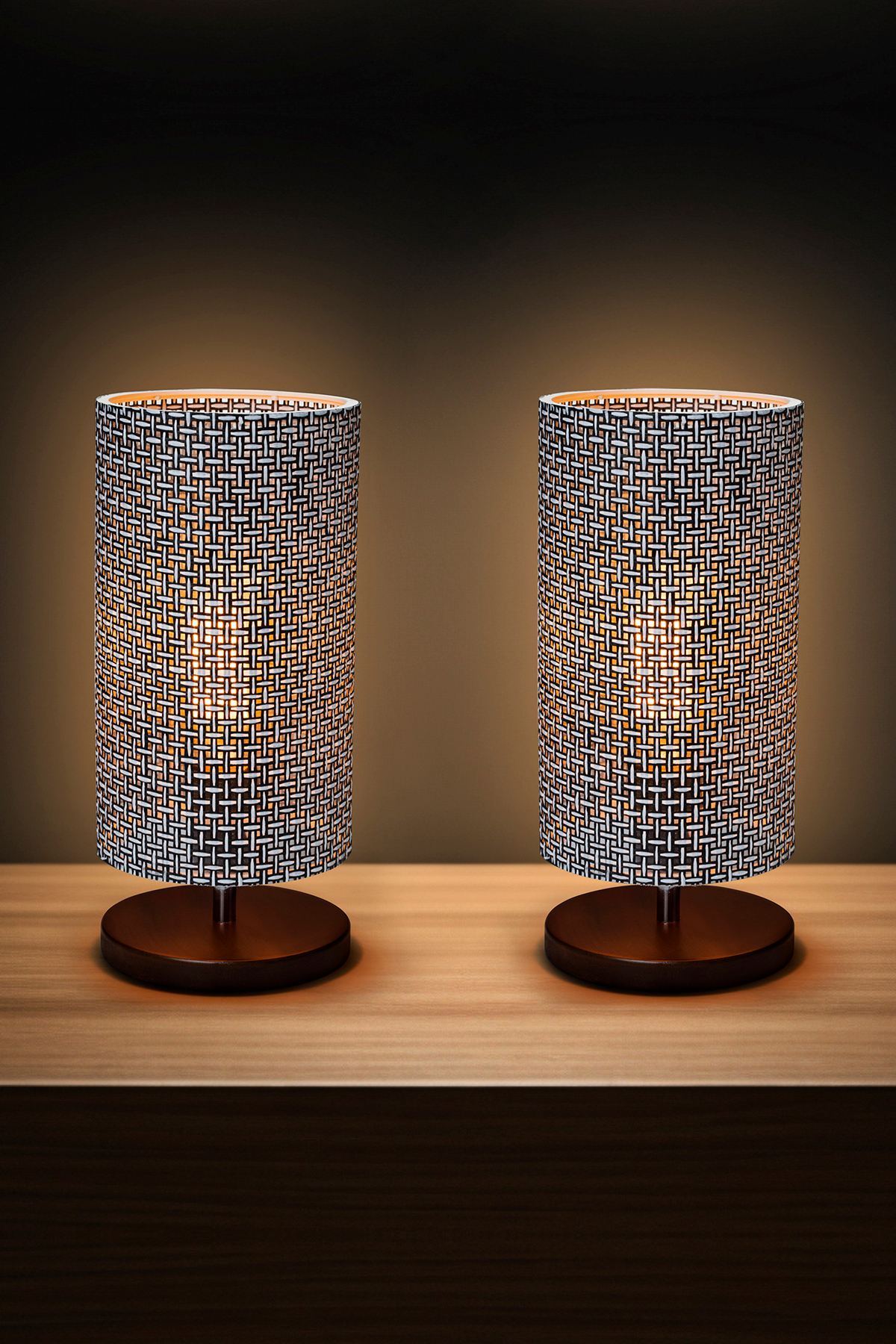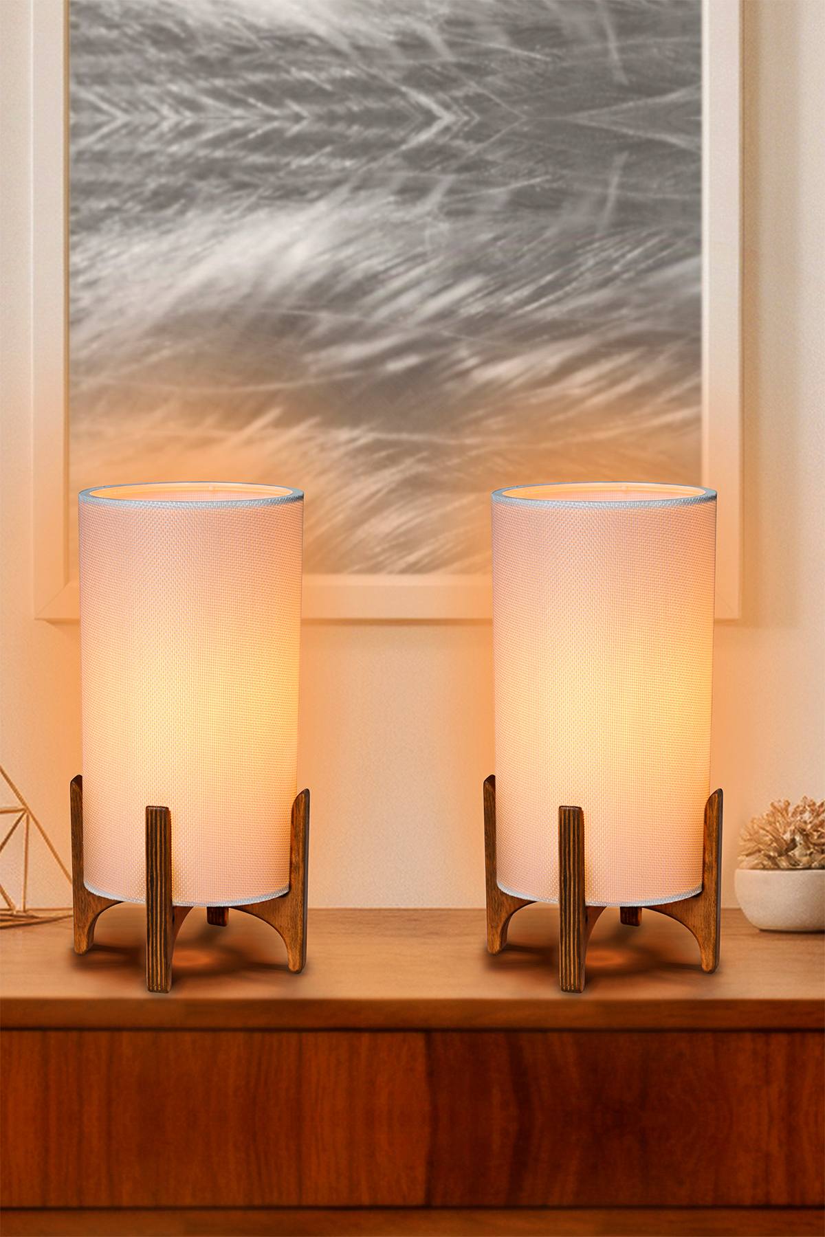 Sağlam doğal ahşap tabanlı, metal gövdeli ve görünür tekstil lifli lamba başlıklı masa lambası.