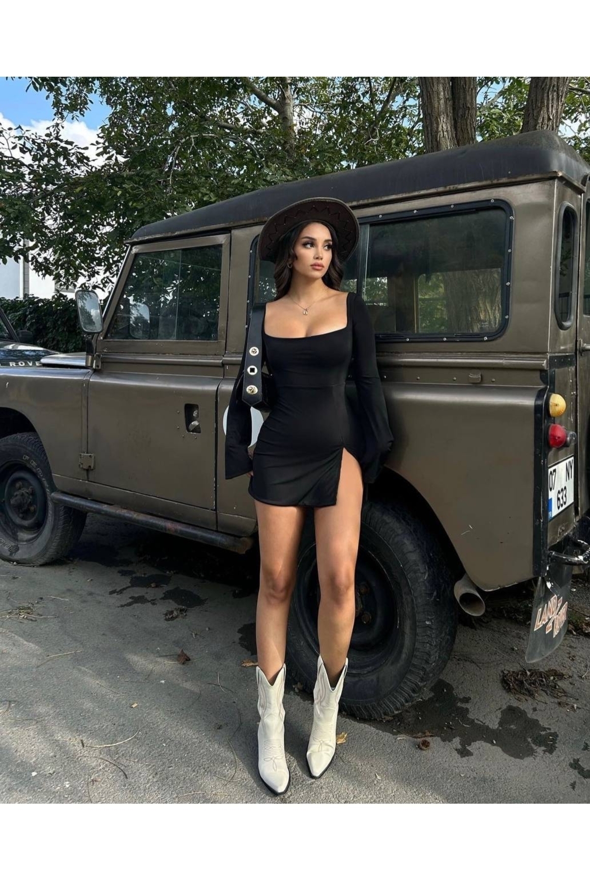 Kadın Volanlı Kol Kare Yaka Yırtmaç Detaylı Kısa Elbise