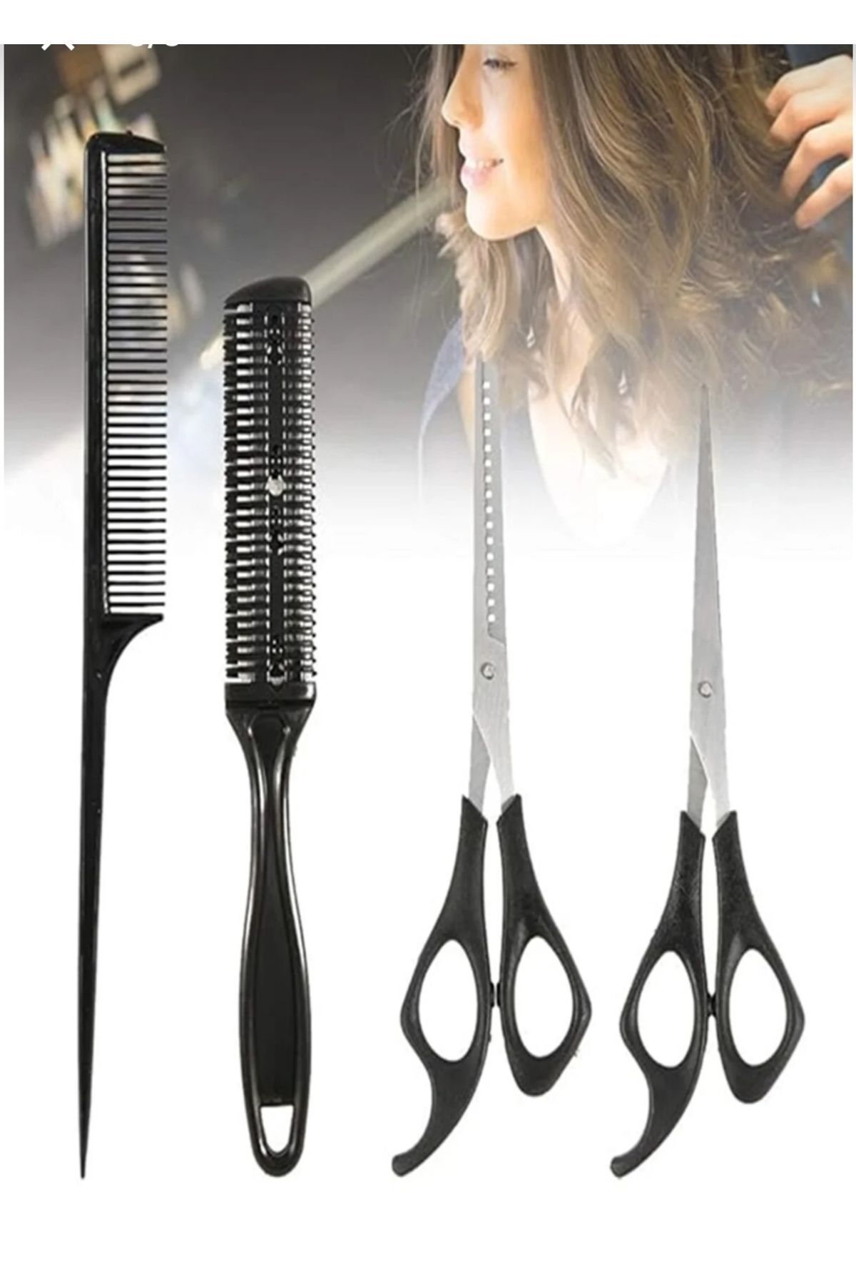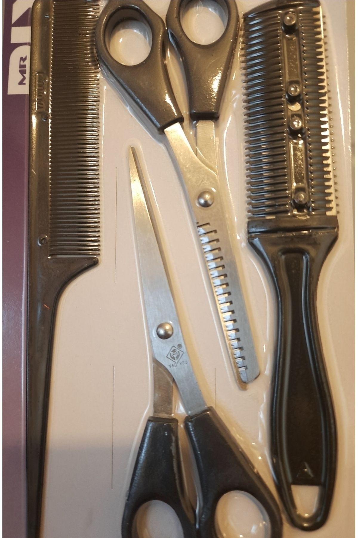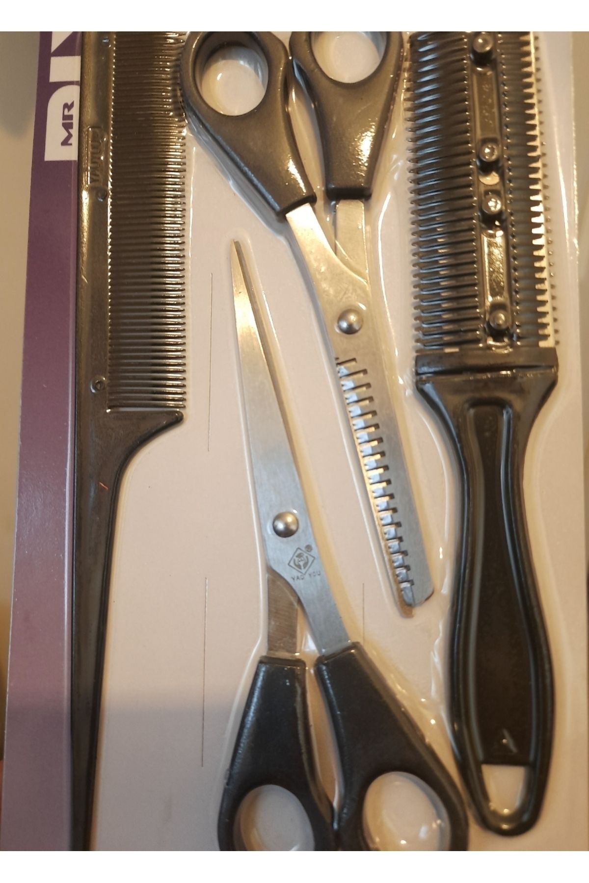 İki adet makas ve iki adet tarak içeren bu set, farklı saç tiplerine uygun kesim imkanı sağlar