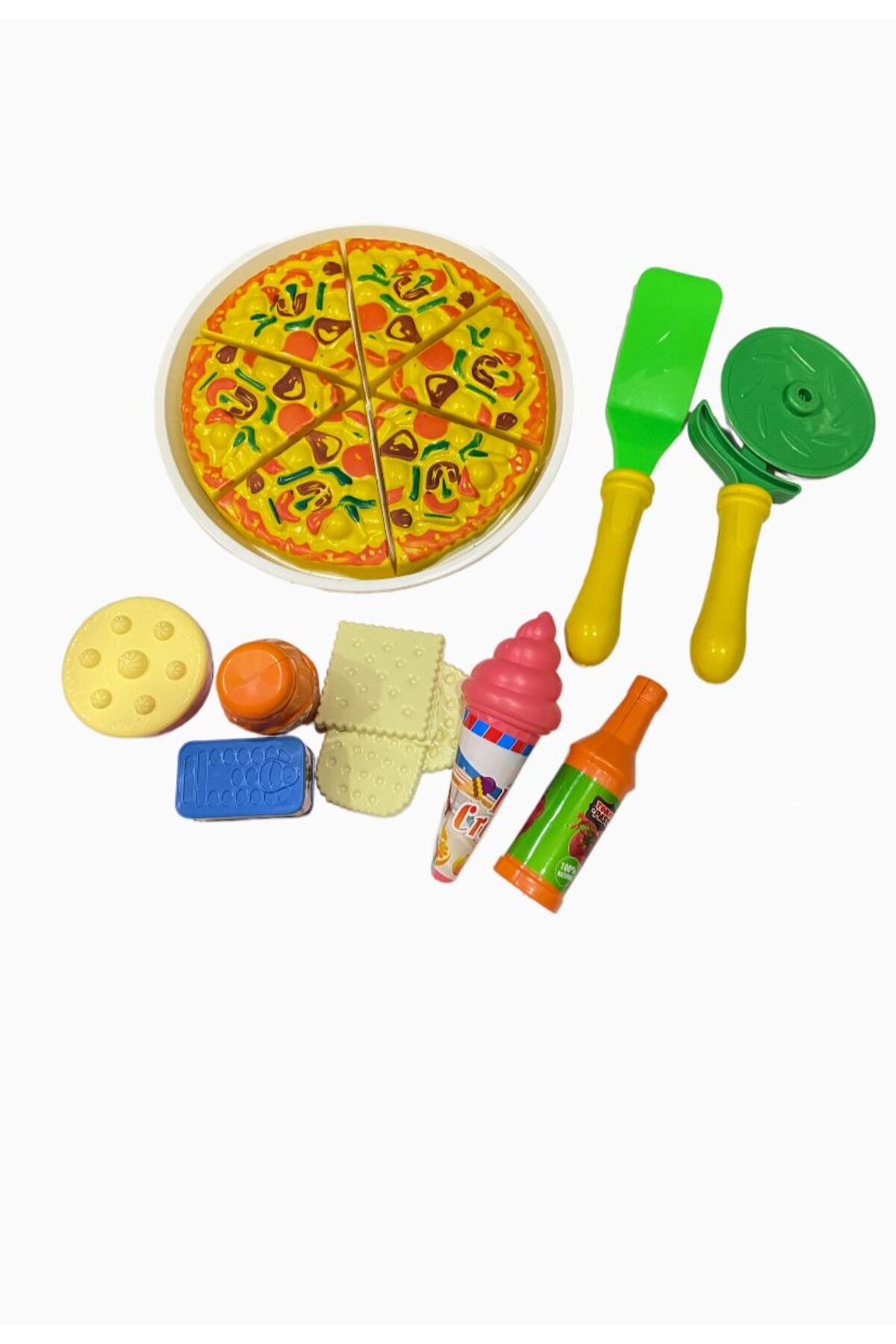 Tost yapımını daha eğlenceli hale getirmek için farklı renk ve şekillerde plastik ekmek dilimleri içerir.