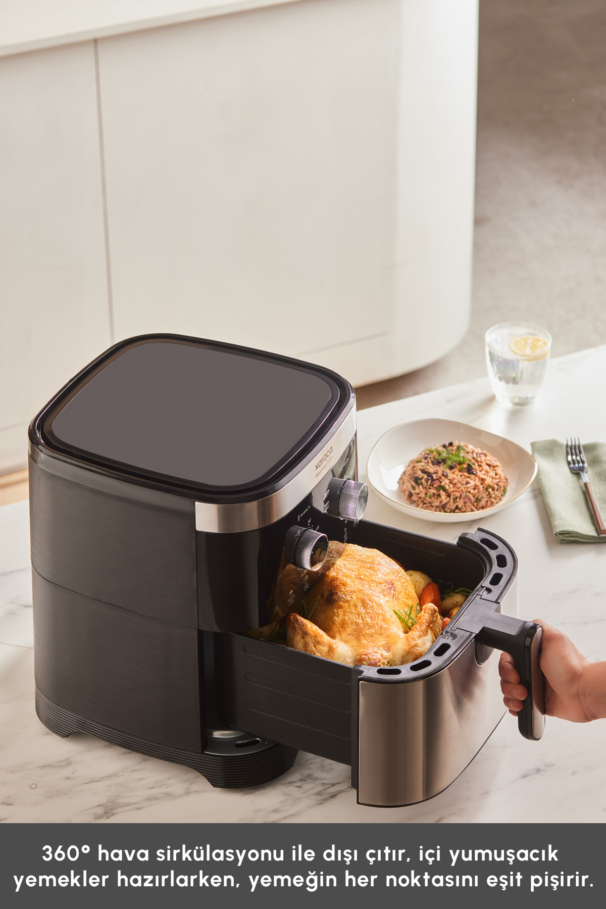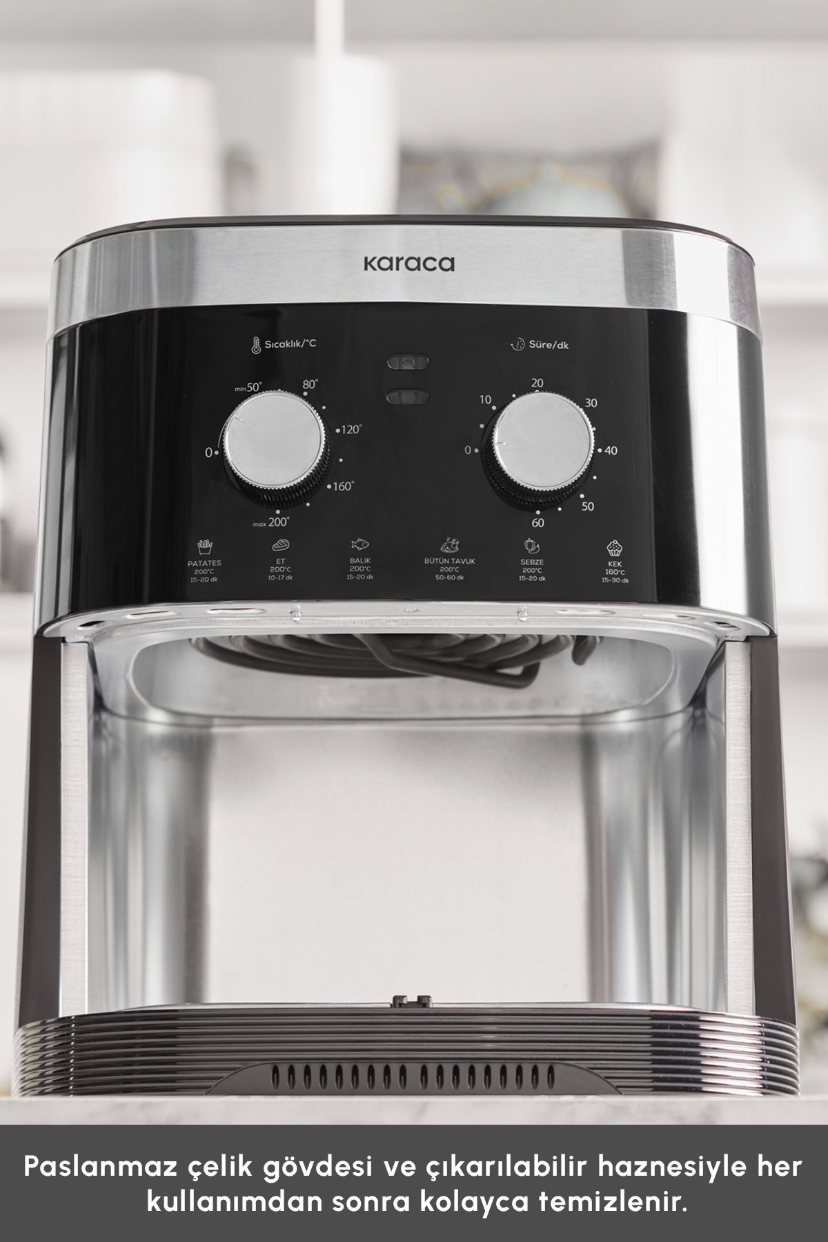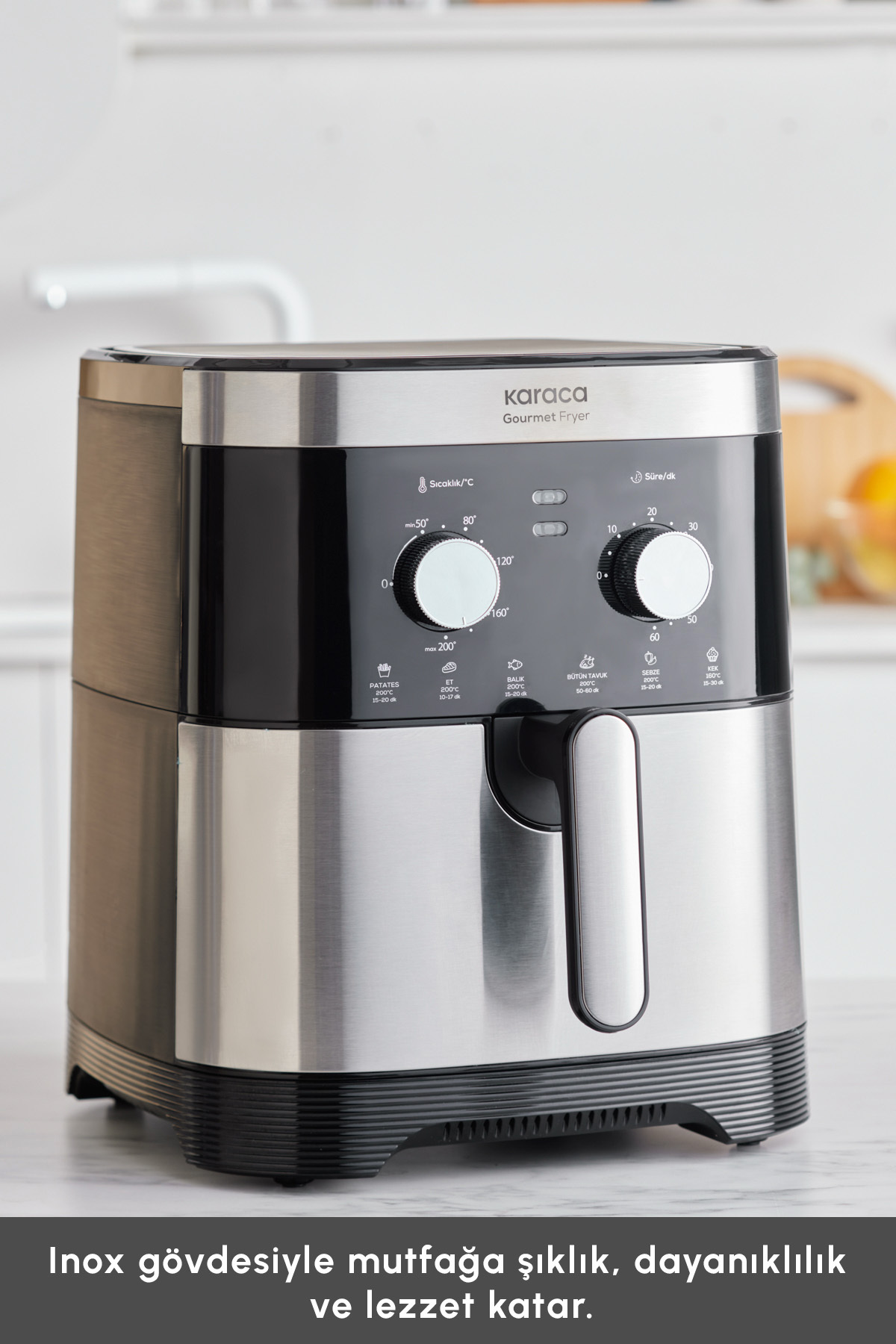 Karaca gourmet 9 litre ekstra büyük hacim 8 kişilik airfryer Inox gövdesiyleBirbirinden lezzetli yemeklerinizi hazırlarken mutfağınıza şıklık katan modern yardımcınız olacaktır.