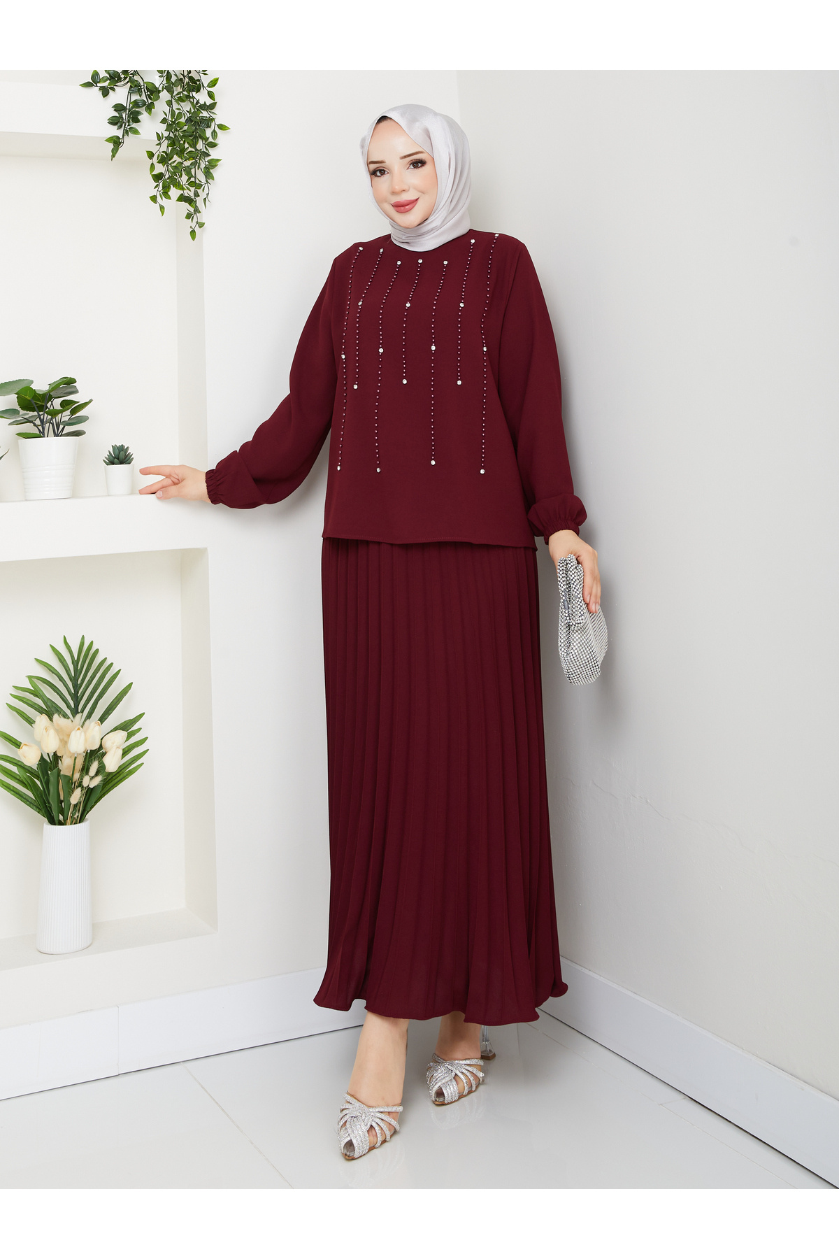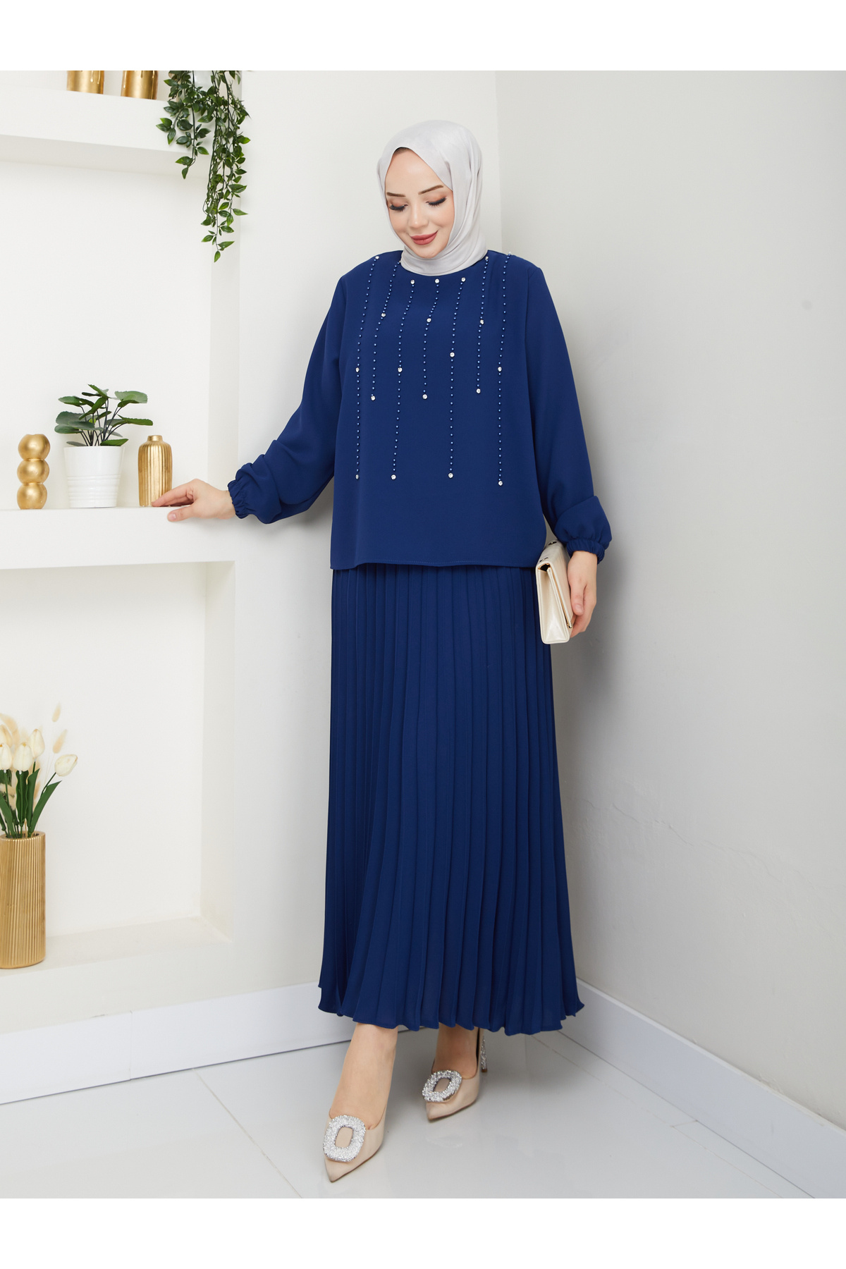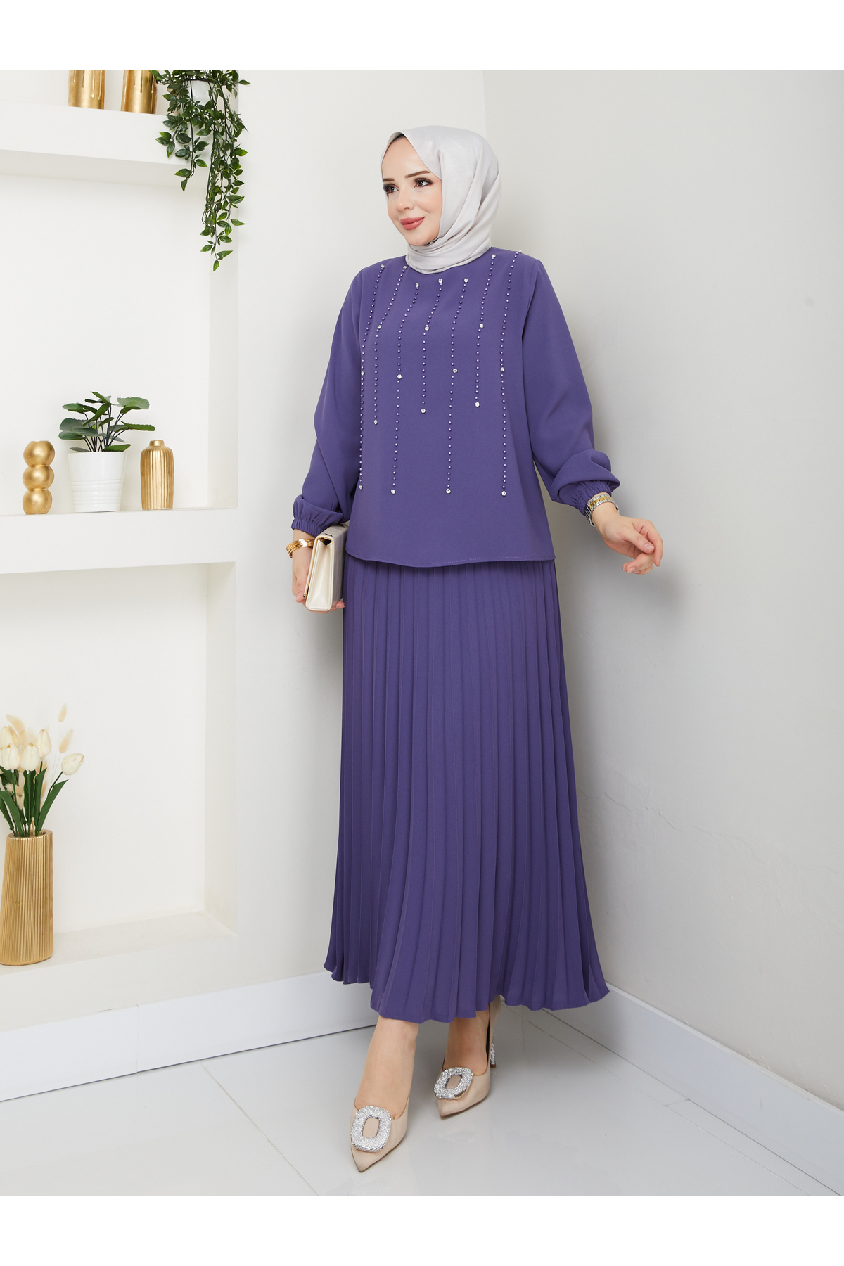 Tesettür giyim koleksiyonuna özel olarak tasarlanmış bu takım, modern ve şık görünümüyle dikkat çeker