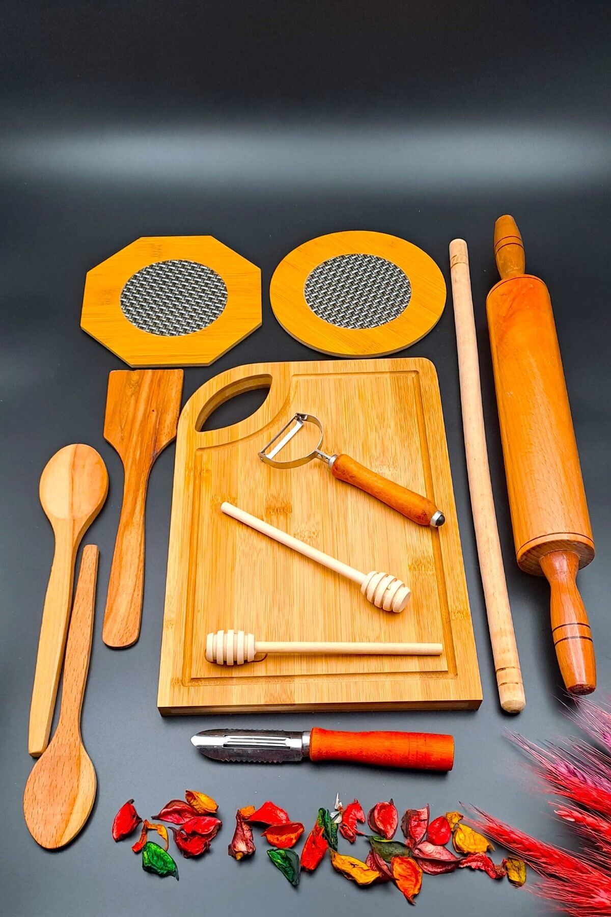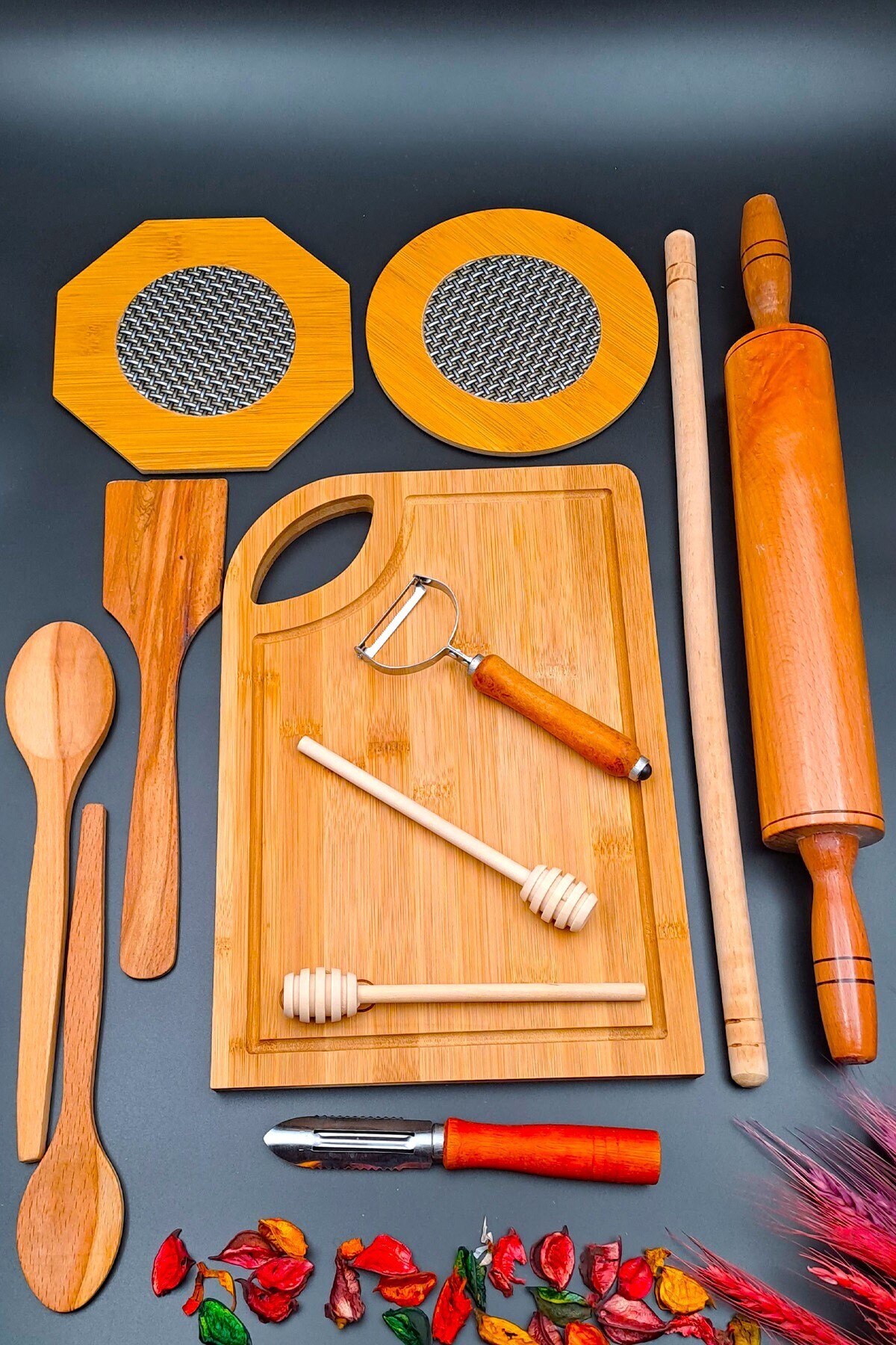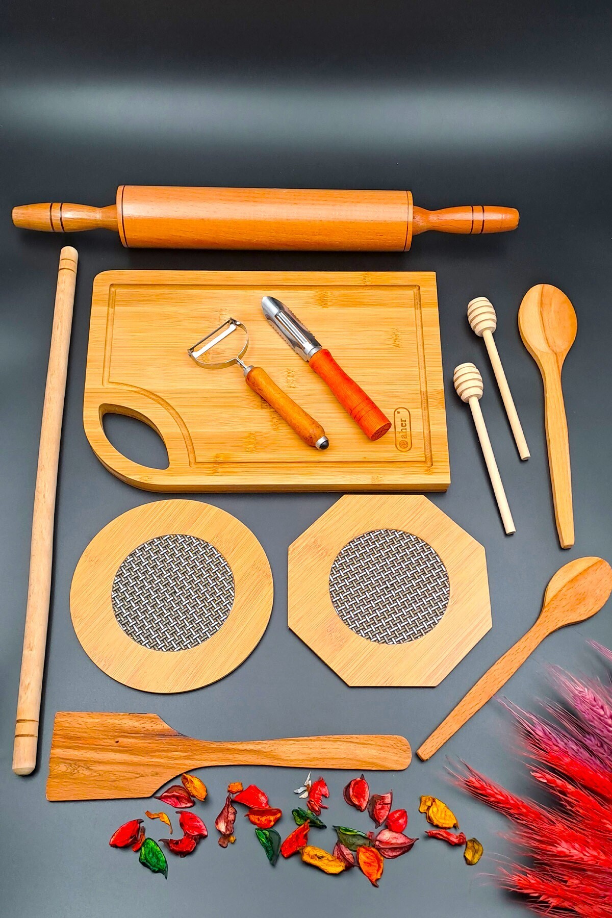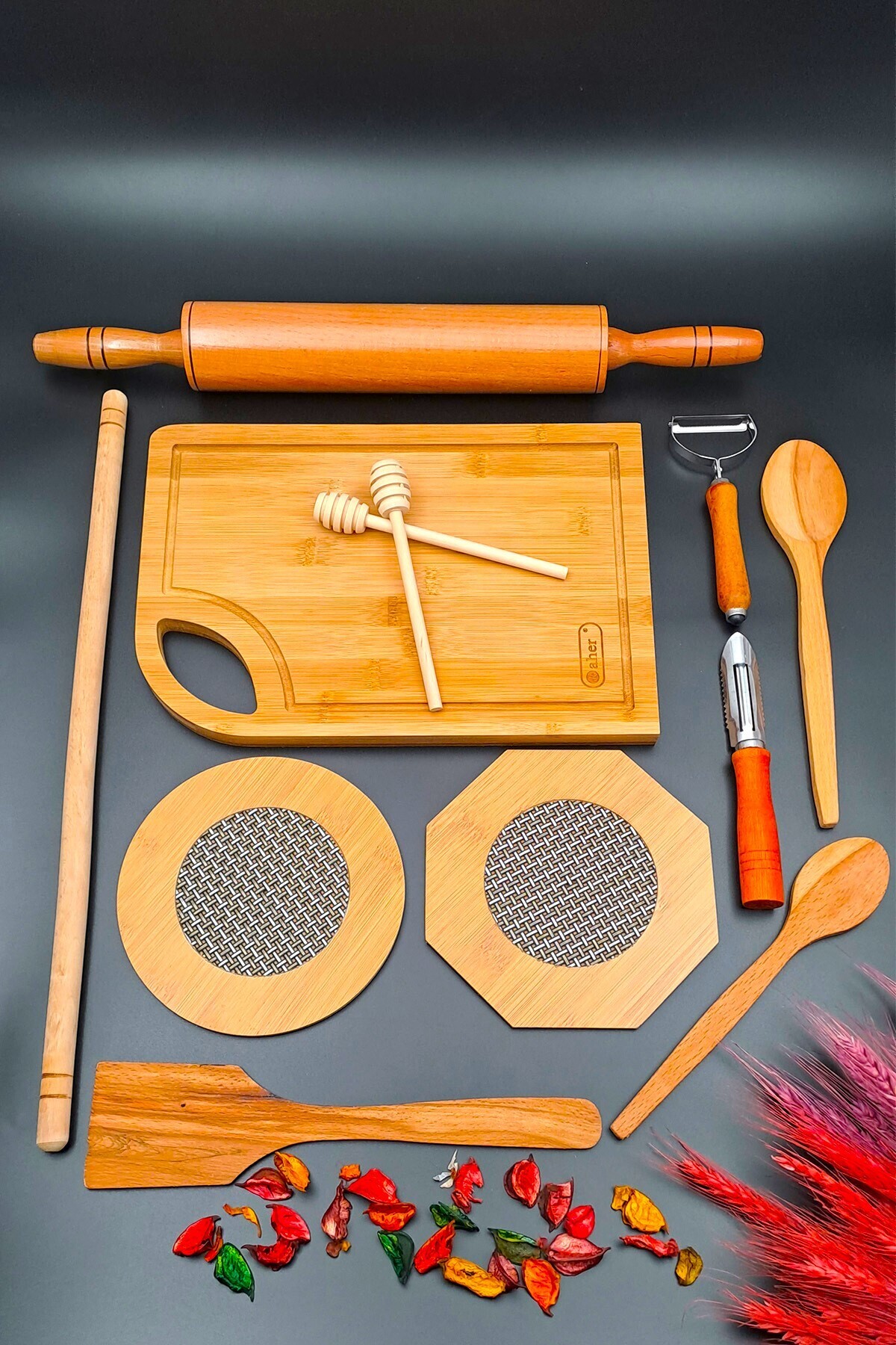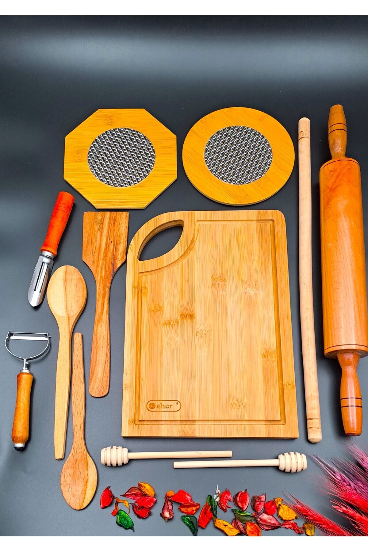 Paket içeriği: LÜKS AHŞAP DÖNERLİ MERDANE OKLAV KESME TAHTASI NİHALE OYACAK SOYACAK VE BAL KAŞIĞI ANNELERE ÖZEL 12 PARÇA