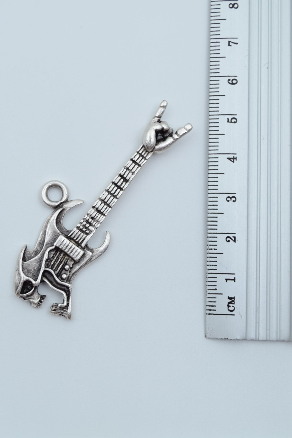 Ürün antik gümüş kaplama Kuru Kafa Elektro Gitar Kolye: Bu özel antik gümüş kaplama kolye, kuru kafa motifi ve elektro gitarı birleştiren benzersiz bir tasarıma sahiptir.