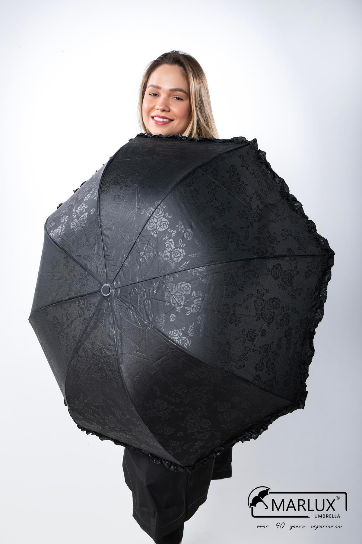 Siyah Tam Bombeli Gizli Çiçek Desenli Kadın Şemsiye