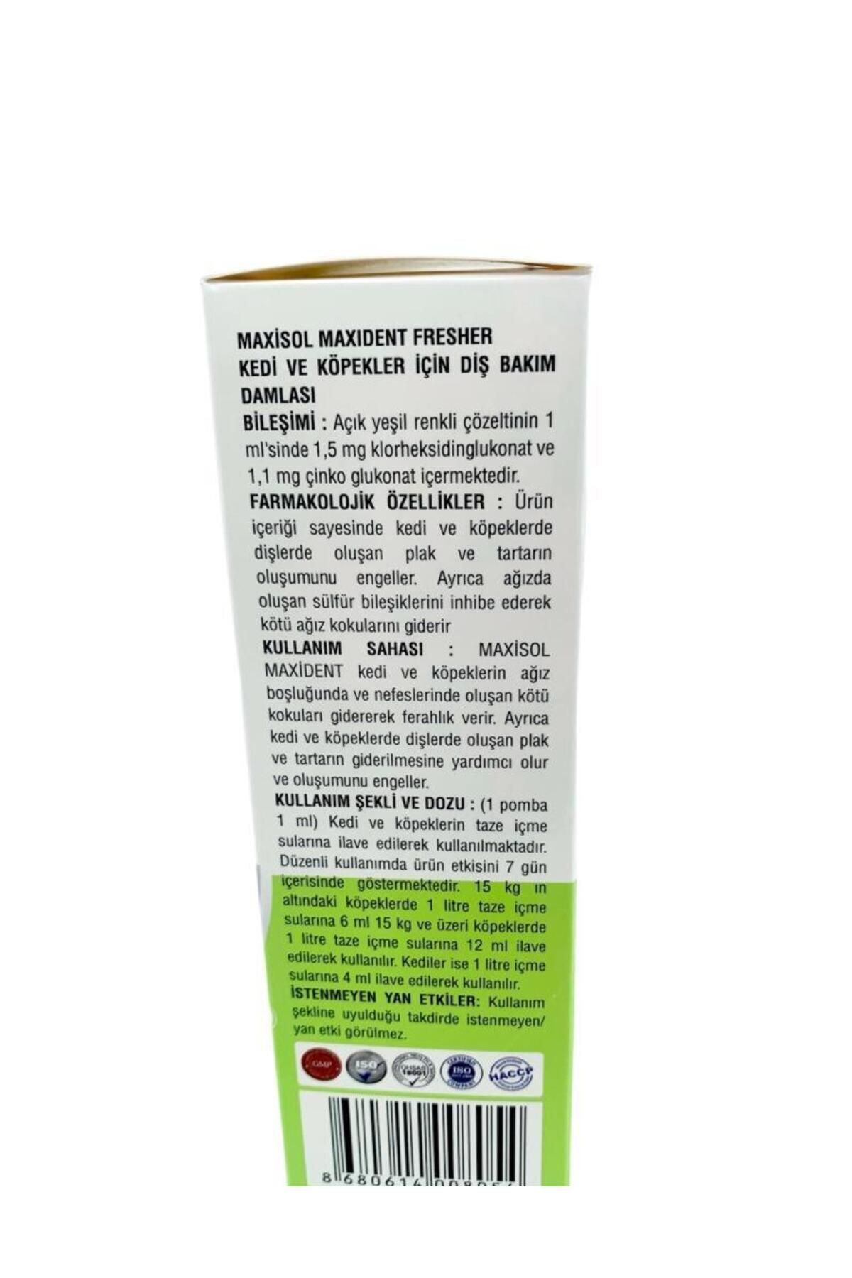 Maxident Fresher Kedi ve Köpekler İçin Diş Bakım Spreyi 100 ml Bileşimi: Açık yeşil renkli çözeltinin 1 ml sinde 1,5 mg klorheksidinglukonat ve 1,1 mg çinko glukonat içermektedir.