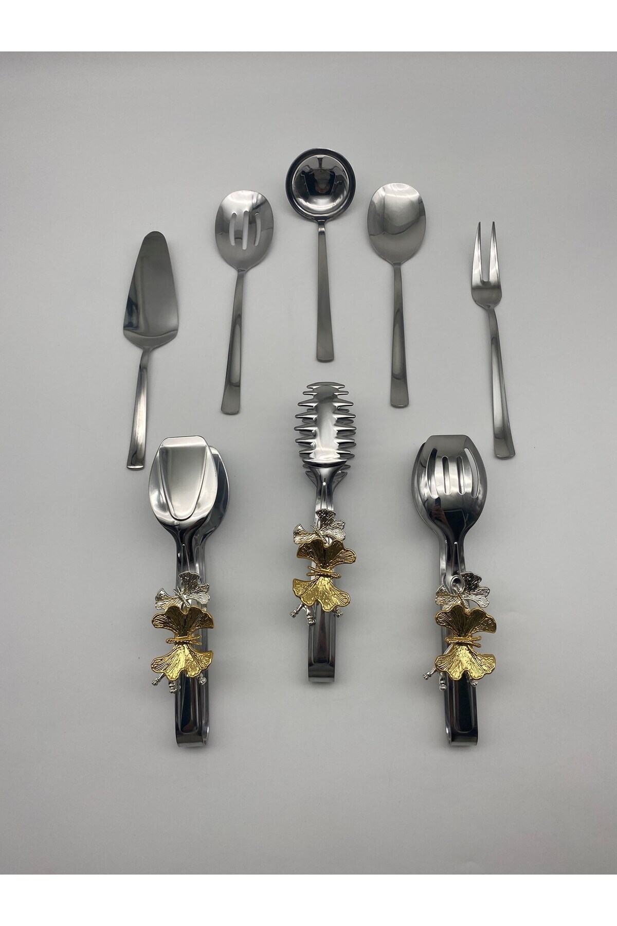 Elegan ve modern tasarımın mükemmel bir birleşimi olan 8'li Paslanmaz Çelik Gümüş Servis Takımı, sofralarınıza şıklık ve zarafet katmak için tasarlandı.