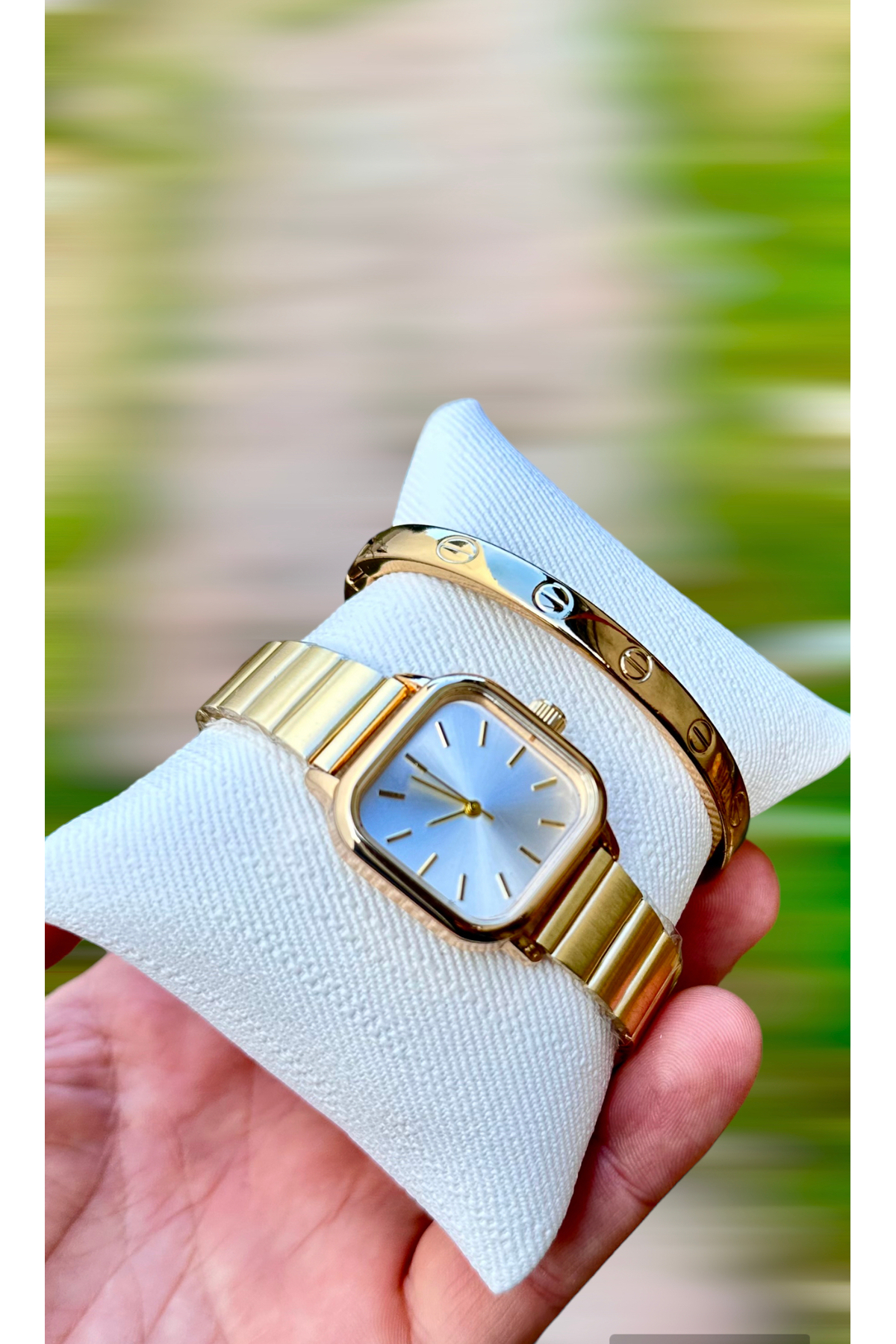 Altın rengi kasa, zarif tasarımıyla her türlü kıyafetle uyum sağlar ve göz alıcı bir aksesuar oluşturur