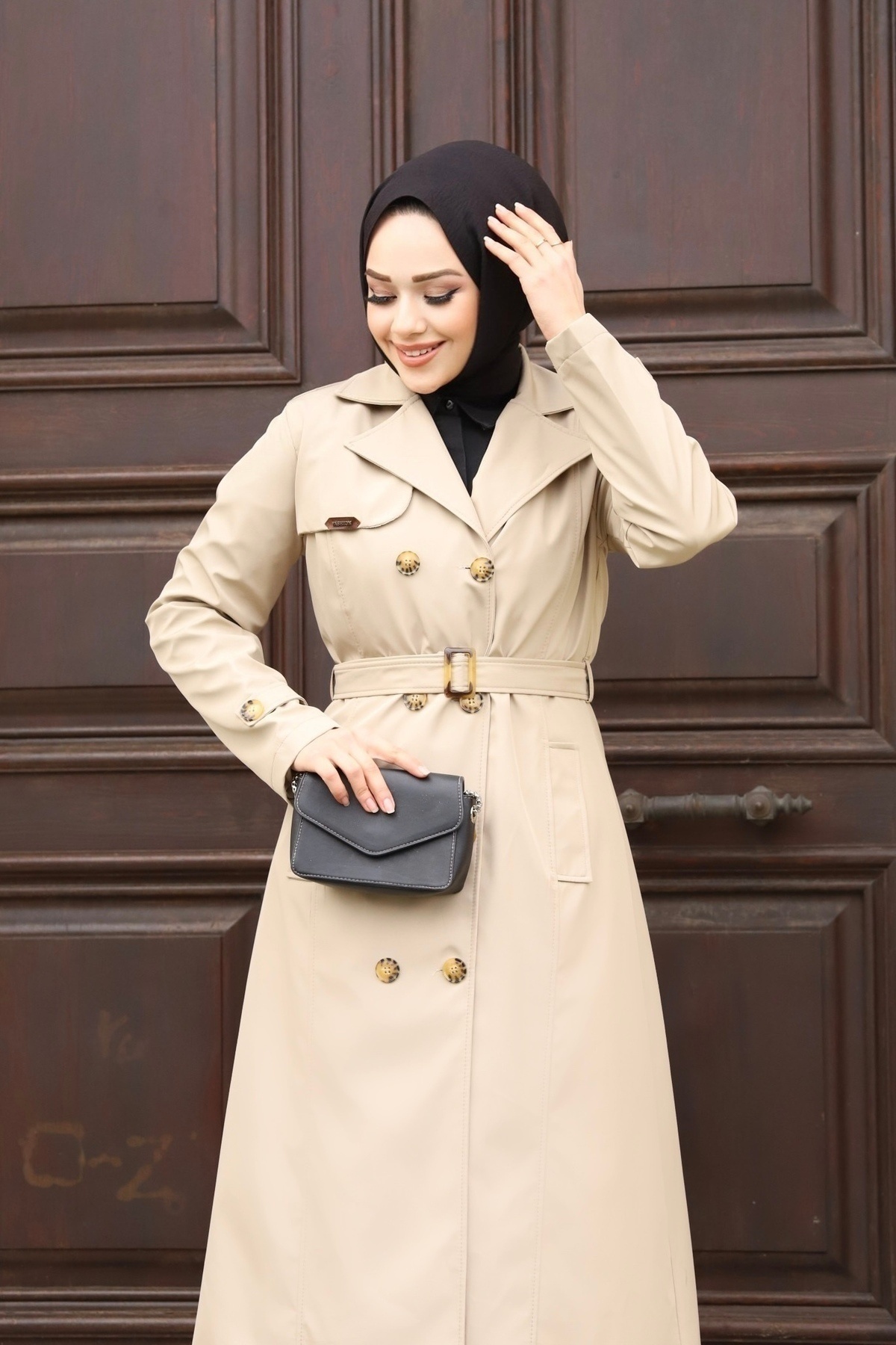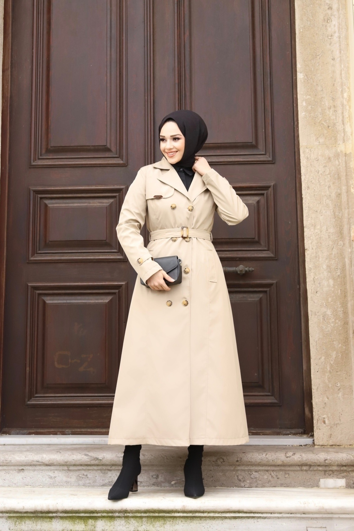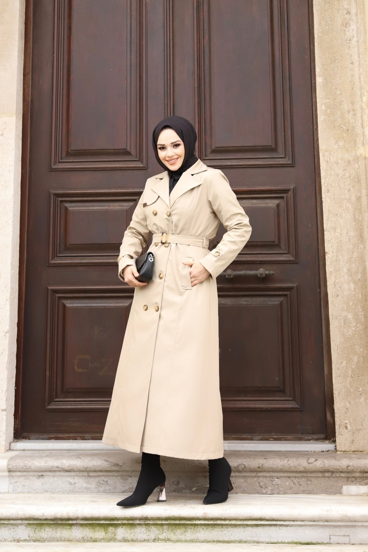1. Kalite Kruvaze Yaka Astarlı Uzun Kadın Tesettür Trençkot Krem