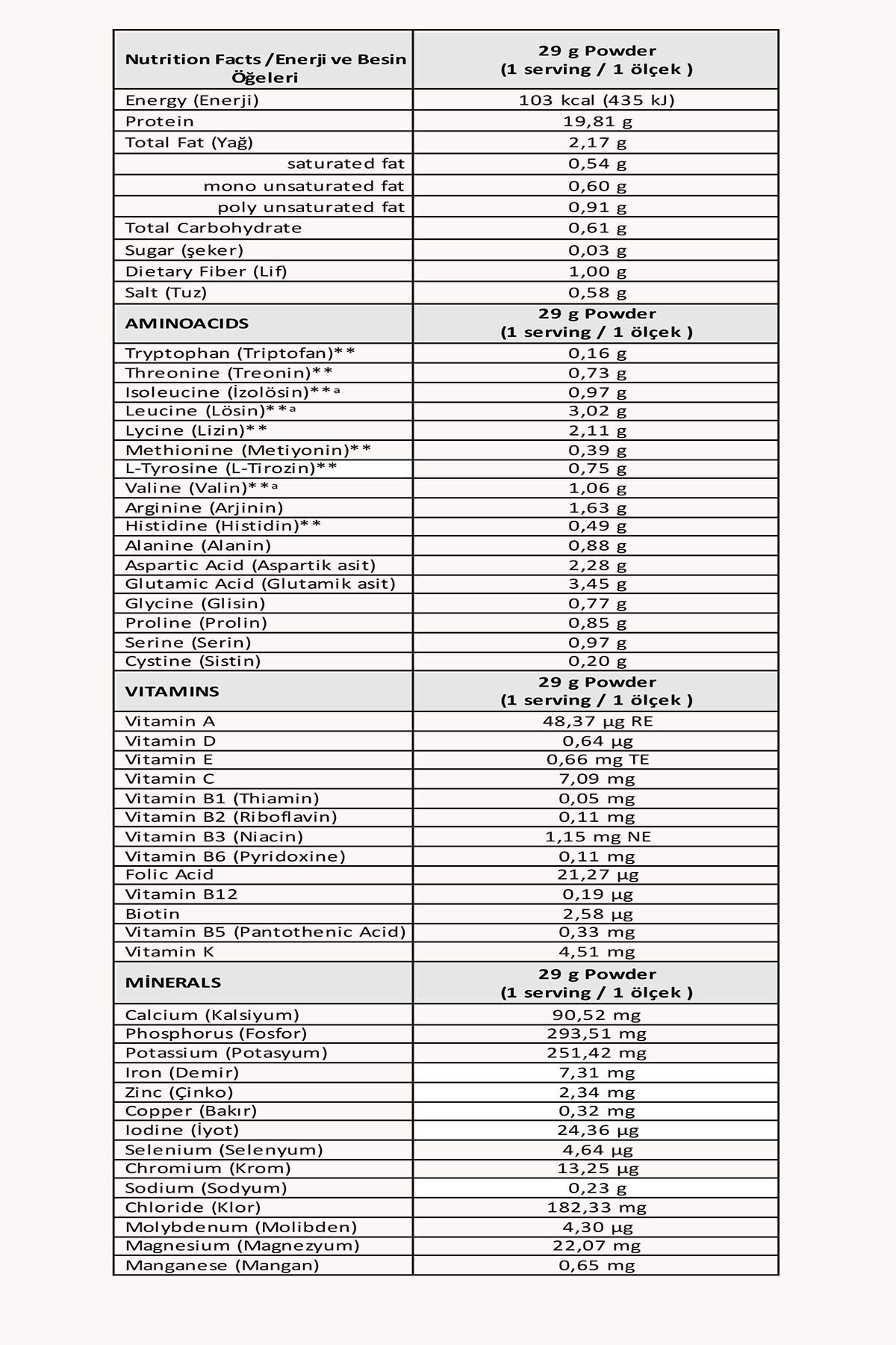 Gluten, Laktoz, Soya, GDO ve herhangi bir hayvansal ürün içermez