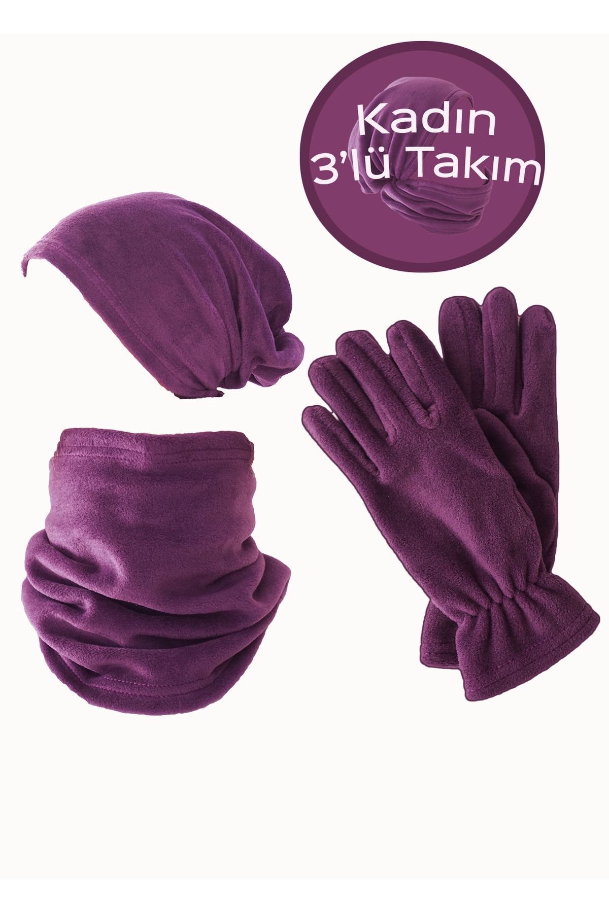 Kış aylarında sıcak tutan ve şık bir görünüm sunan mor şeker termal kışlık polar eldiven, bere ve boyunluk seti
