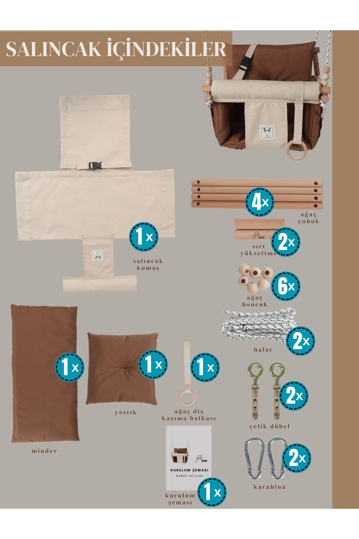 İçerik: Salıncak + Minder + Yastık + 2 Adet Çelik Dübel + 2 Adet Karabina Kanca + Askı Halatı