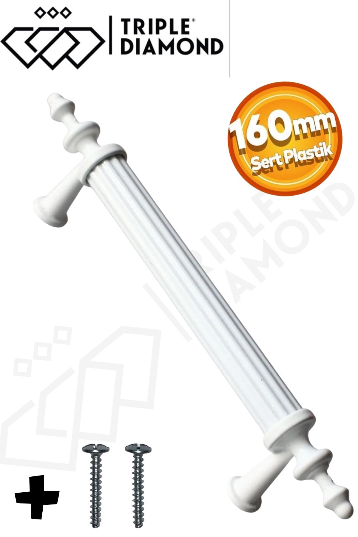 160 mm çapında, beyaz renkli, sert polimer malzemeden üretilmiş, çift delikli tasarımı sayesinde kolay montaj imkanı sunan çekmece kulpu