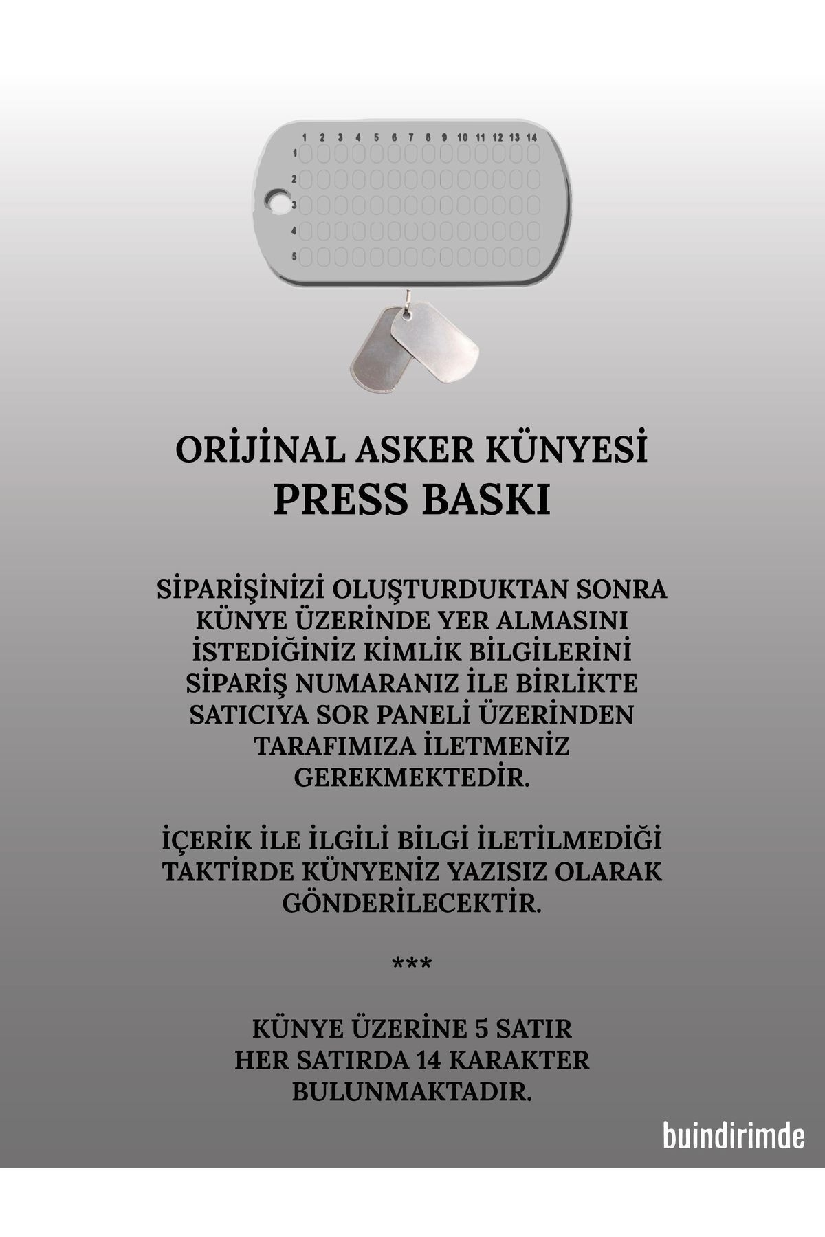 Askere giderken, yazdırdığınız künye ile beraber gideceksiniz Künyenizi Satın Aldıktan Sonra Künyenin Üzerine Yazılacak Bilgileri sipariş notunuzda/mesajınızda belirtiniz