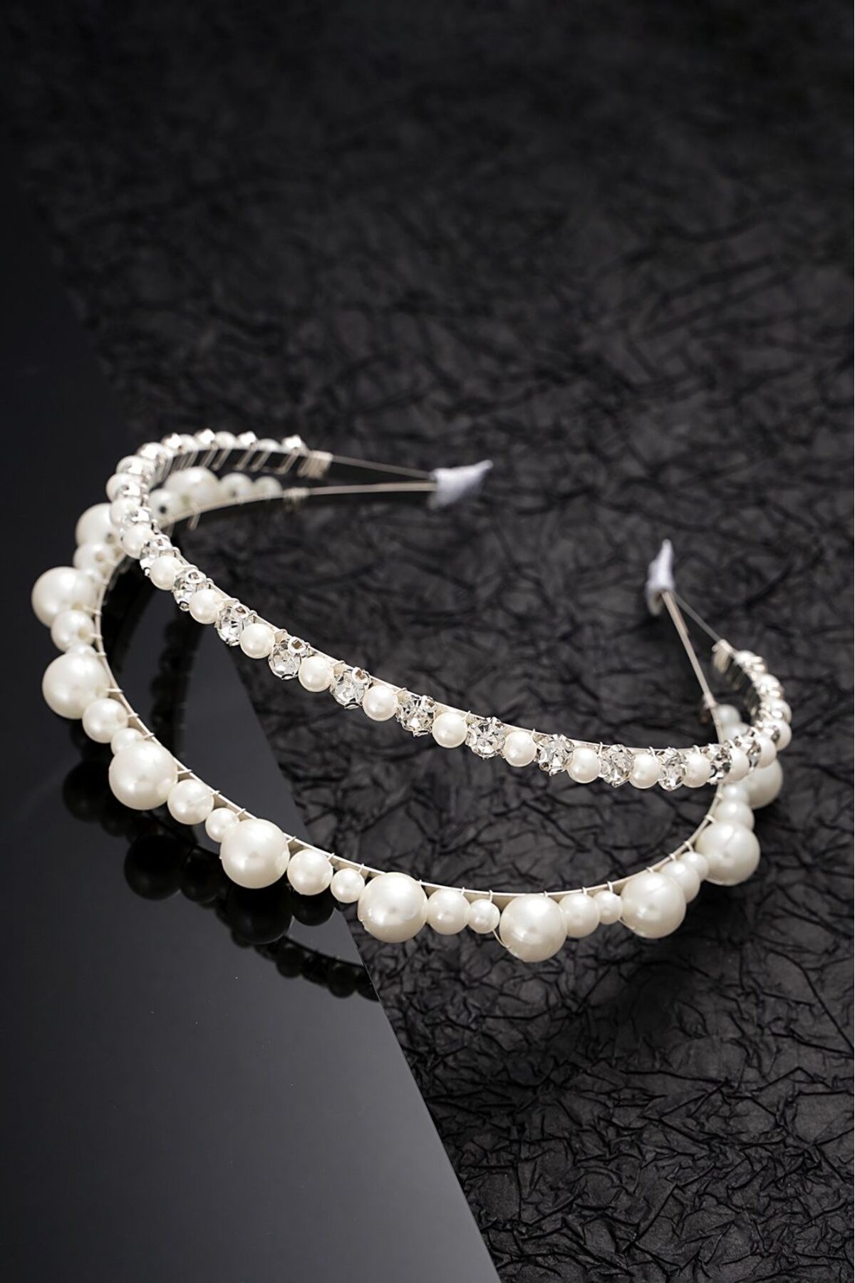 Özel günlerde zarafeti ve göz alıcı ışıltıyı temsil eden çift sıra zirkon taşlı gelin tacı, her gelinin hayalindeki peri masalı gibi bir görünüme kavuşmasını sağlar.