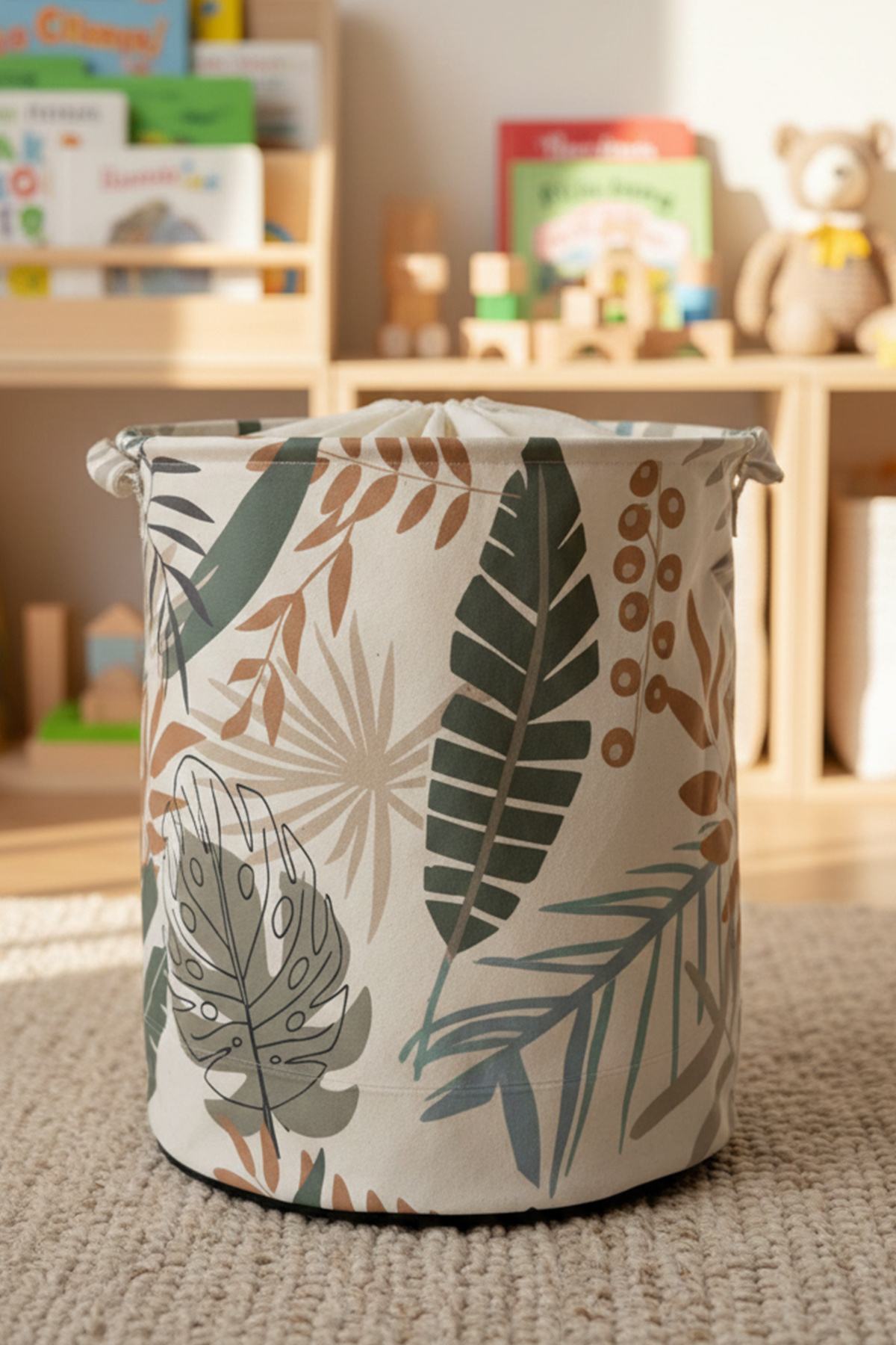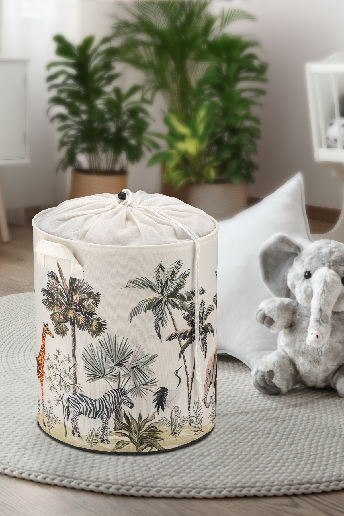 Kaliteli kumaşı, şık dizaynı ve canlı görseliyle özellikle çocuk odalarında kullanabileceğiniz silindir ağzı büzgülü sepet.