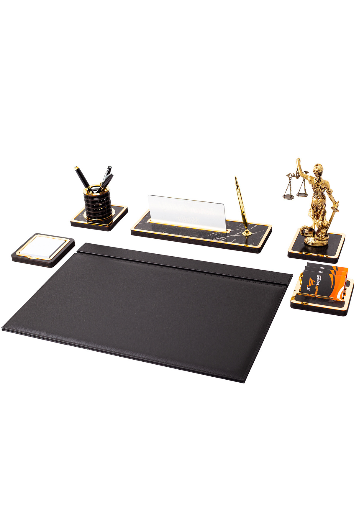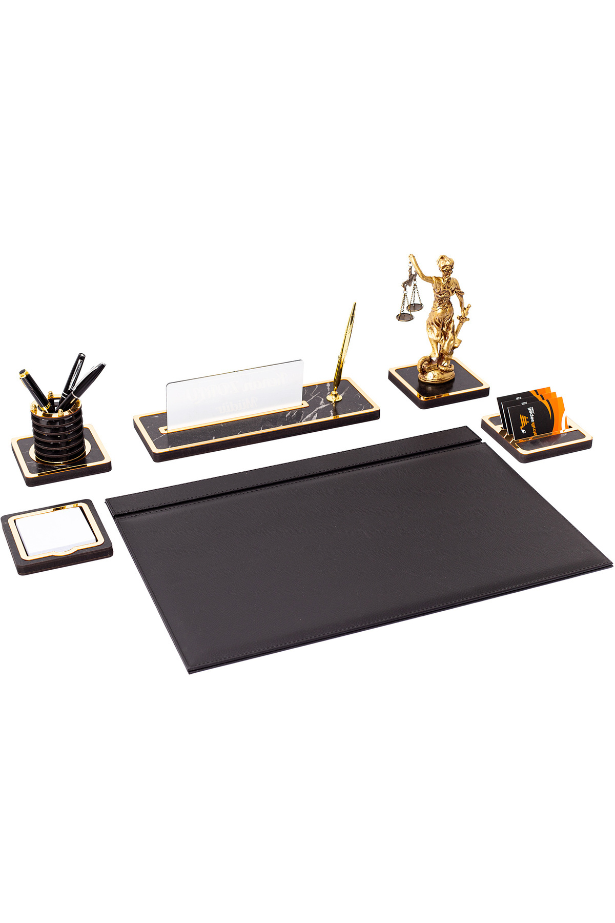 Ürün Genel Özellikleri Ürün Hammadde : Deri & Ahşap Yazı Tipi : Uv Baskılı Ürün Üzerinde Yer Alan Aksesuarlar Mermer Desenli Ahşap Masa İsimliği Mermer Desenli Ahşap Üzerinde Themis Heykeli Mermer Desenli Ahşap Notluk Mermer Desenli Ahşap Kartvizitlik Mermer Desenli Ahşap Kalemlik 35cm x 50cm Ebatında Deri Kapaklı Sümen