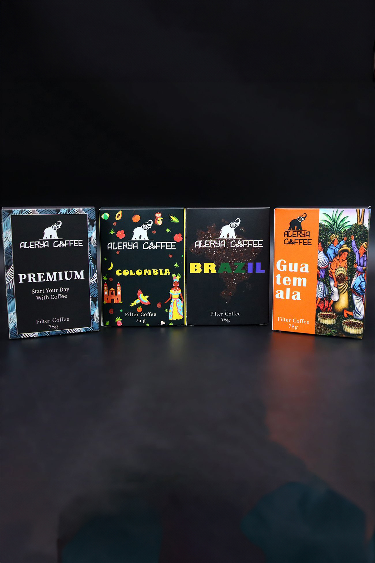 Set içeriği: :1 Adet Alerya Coffee Colombia Filtre Kahve & 1 Adet Alerya Coffee Guatemala Filtre Kahve & 1 Adet Alerya Coffee Premium Filtre Kahve & 1 Adet Alerya Coffee Brazil Filtre Kahve & 1 Adet Geometrik Detaylı Kupa & 1 Adet Siyah French Press Alerya Premium Filtre Kahve *Filtre kahve 75 gr.